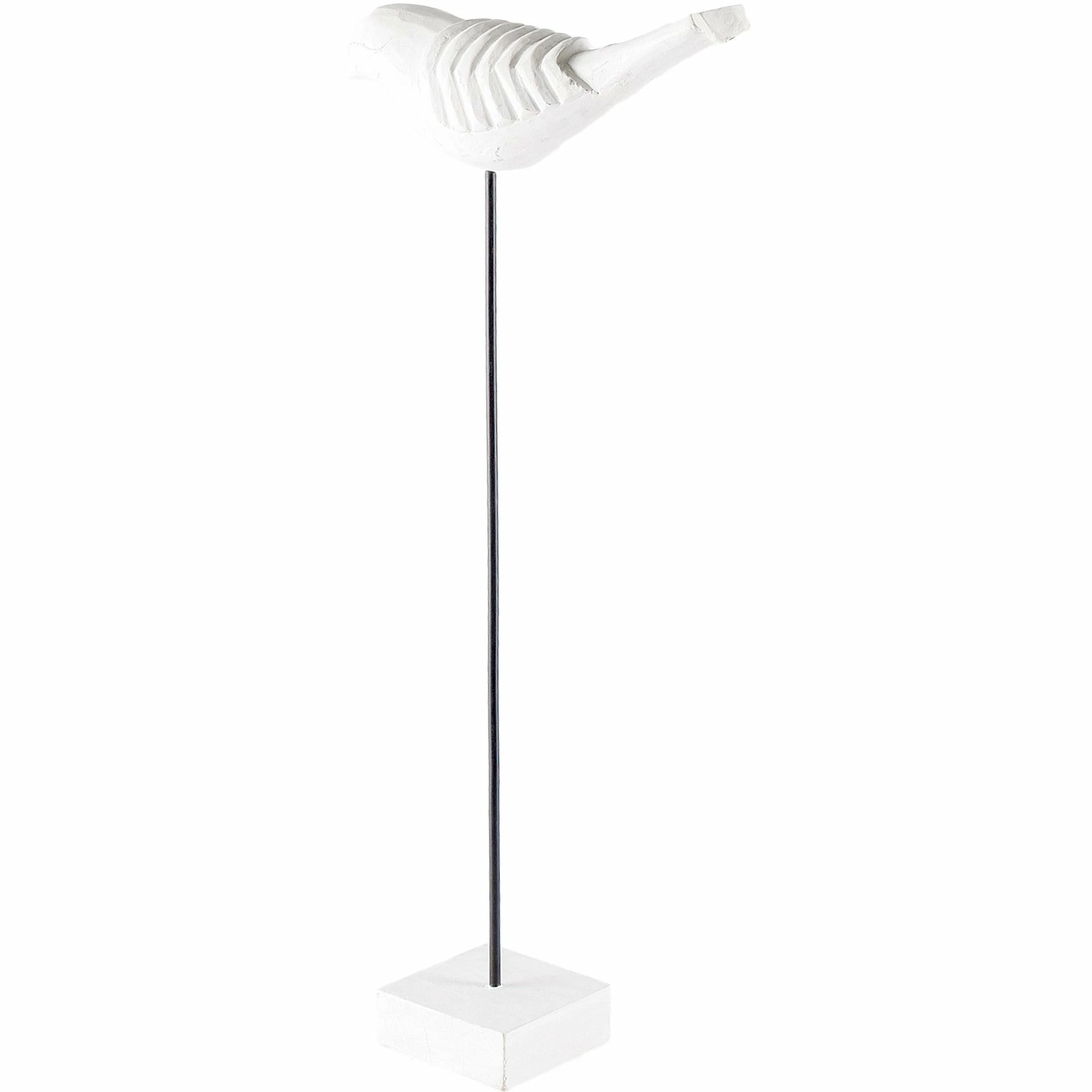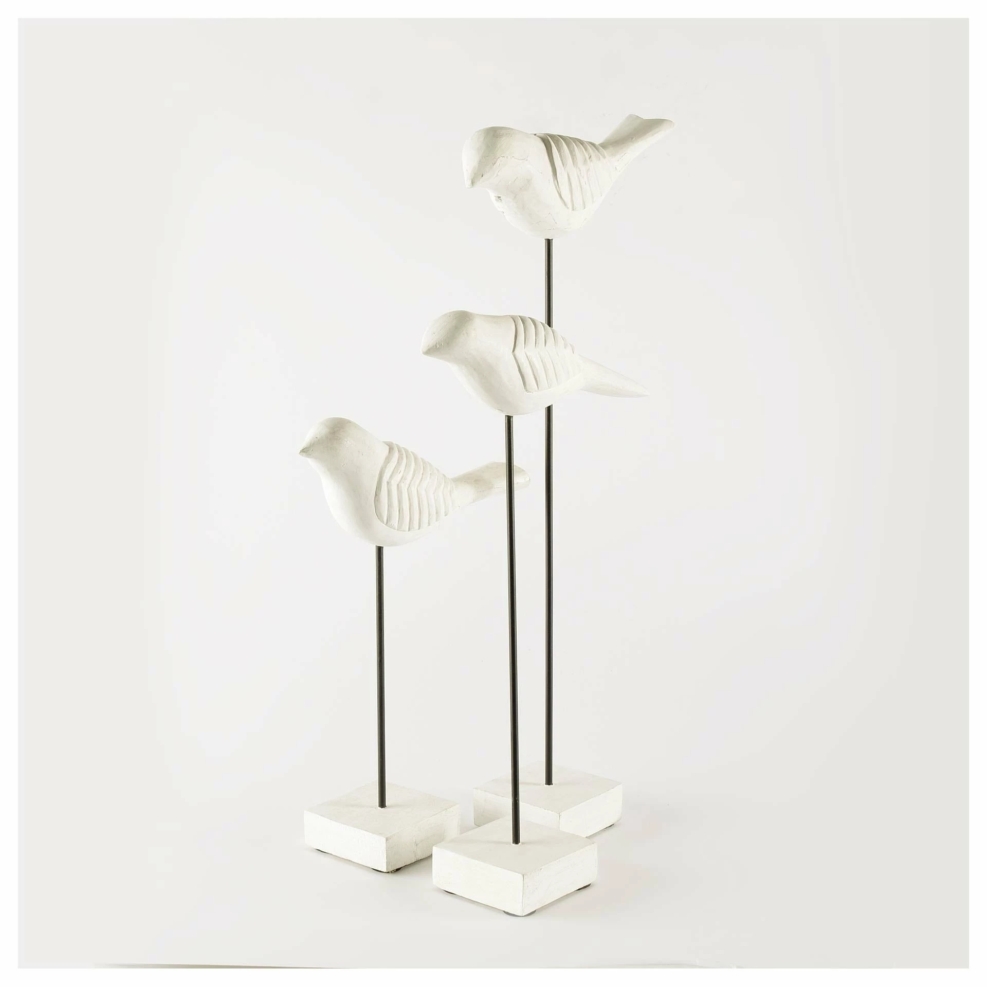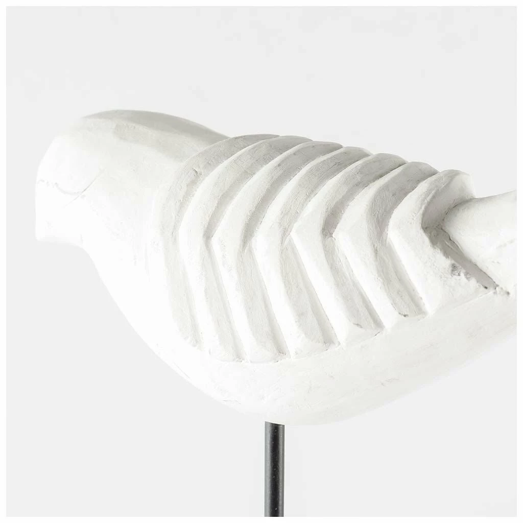 Alouette is a series of hand carved birds made from Indian mango wood with a whitewashed finish and mounted on a black post with a white wooden base..