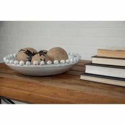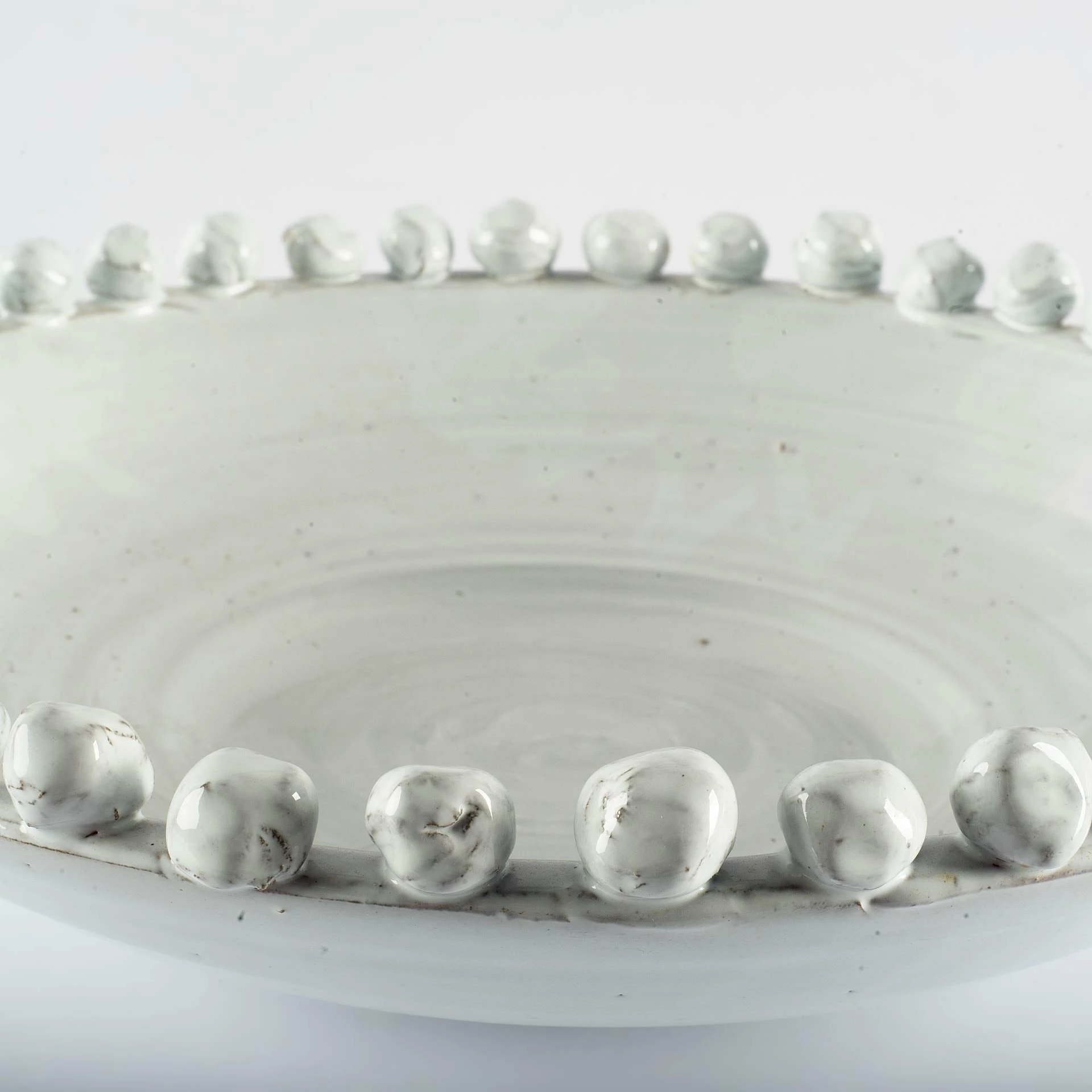 Basin is a low profile ceramic bowl that is great as a decor item or can be functional and hold, keys, fruit or anything you can think of really. It has a off white finish with hand made ball accents circling the top rim.