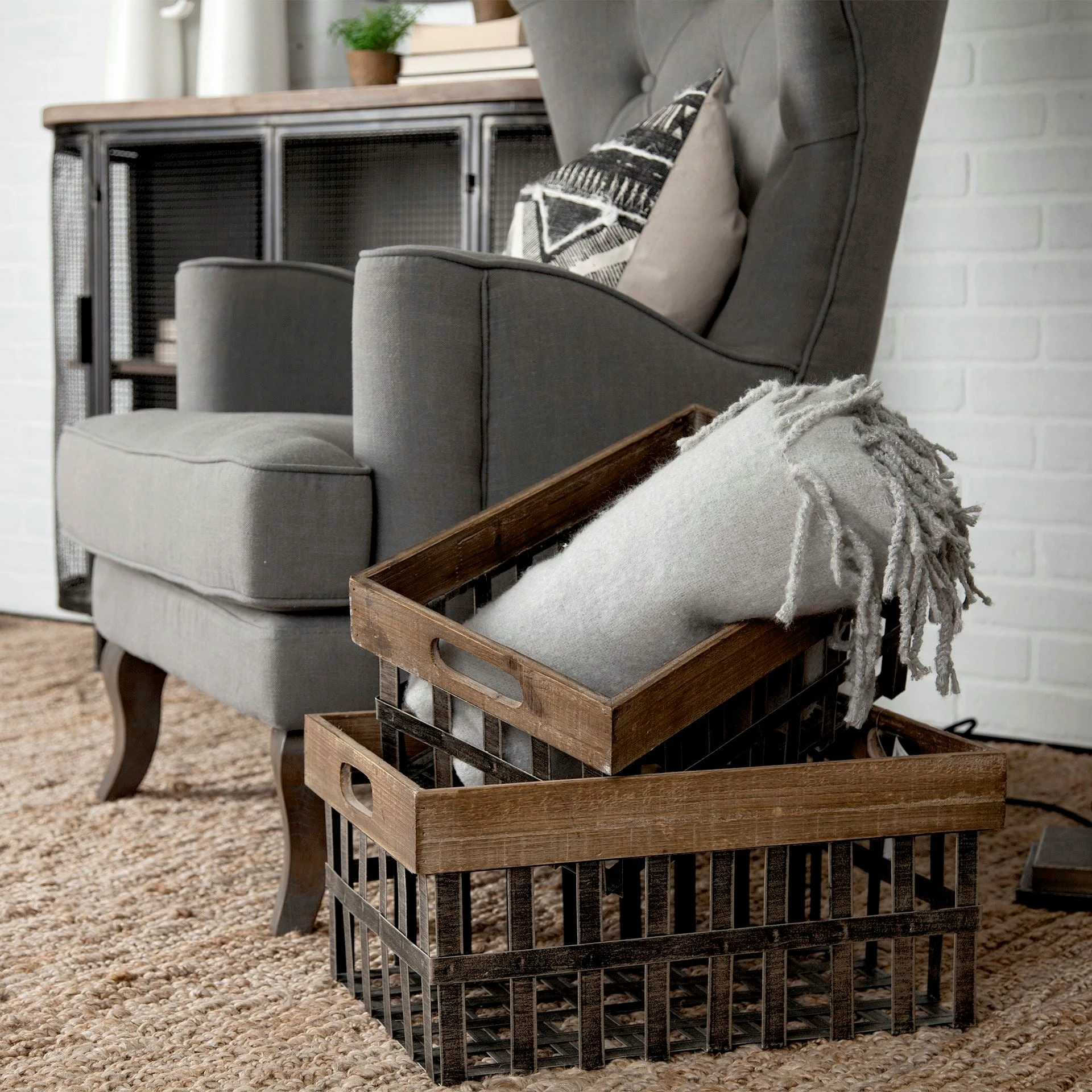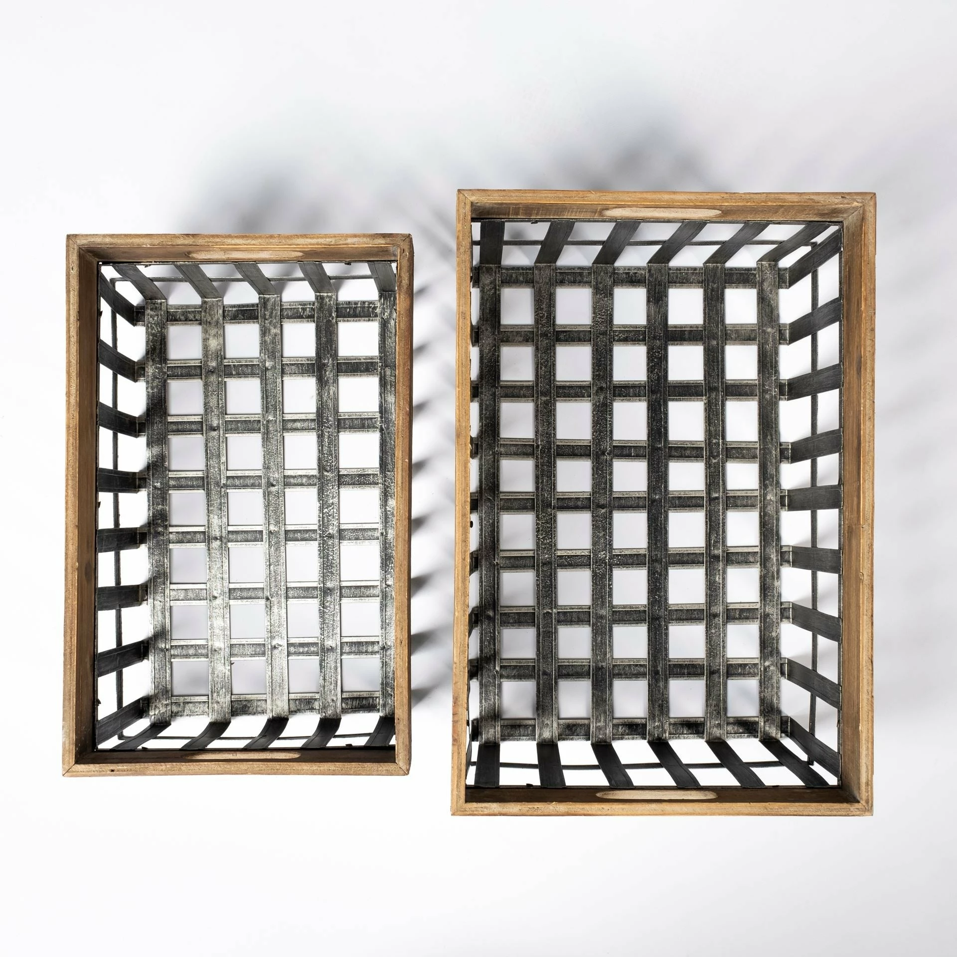 Exhibiting a juxtaposition of metal and wood, the Chartrand is a set of two, open-crate style baskets that are both functional as well as visually appealing. Each of the two baskets features an intertwined flat-metal base finished in a matte-black tone with wooden accents up top. This stunning set of baskets looks fabulous in spaces based on the Farmhouse and Industrial design styles.