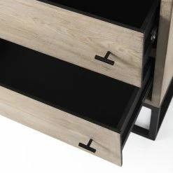 The Ciara cabinet features two light wood, subtly whitewashed drawers upon a black metal frame with simple black metal knobs.ย