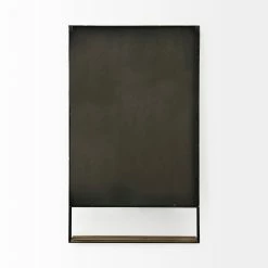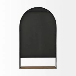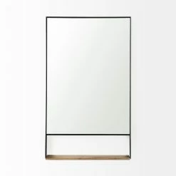 ย A sleek metal mirror with a handy wooden shelf. Available in two styles (Square or Arched Top)