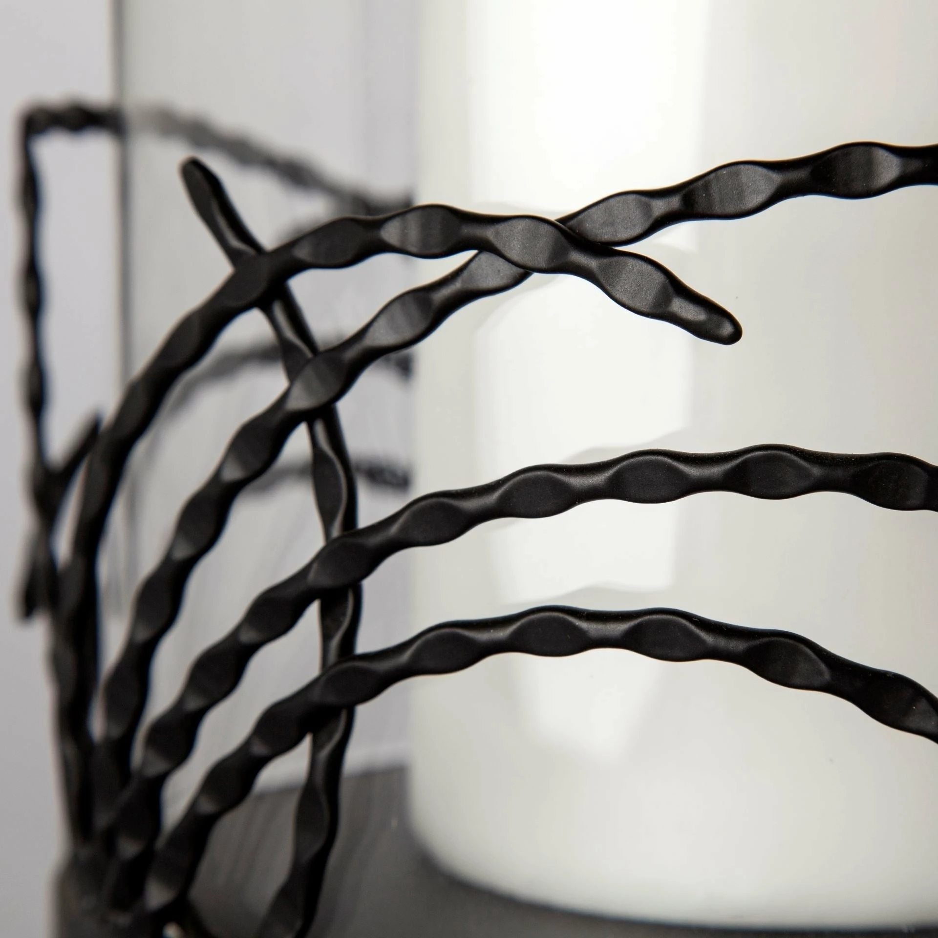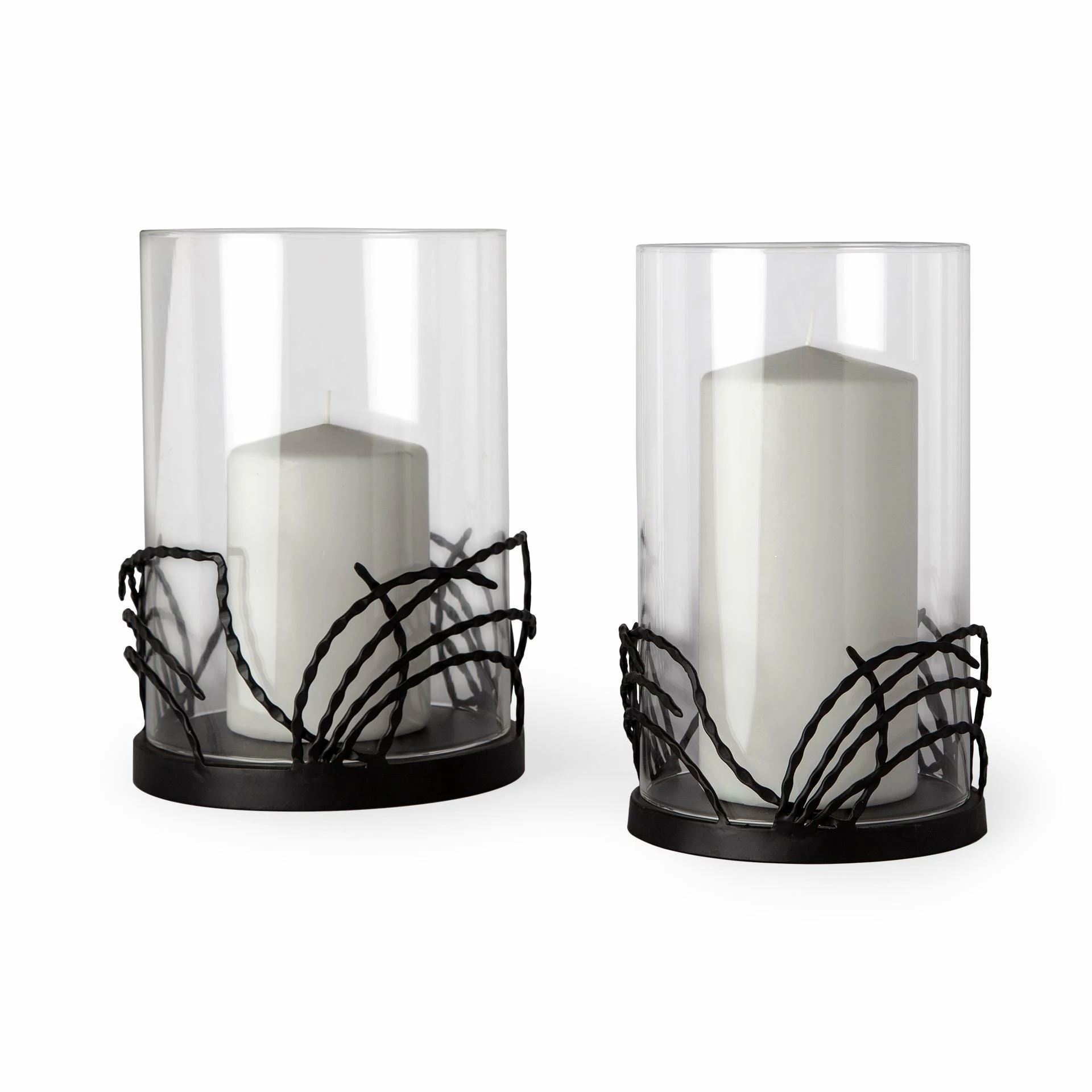 Cutlass is a pair of candle holders with a matte black finish on the metal bases and a large glass hurricane sleeves. (Candles not included). Large: 7 x 7 x 16″ Small: 6 x 6 x 10.75″.