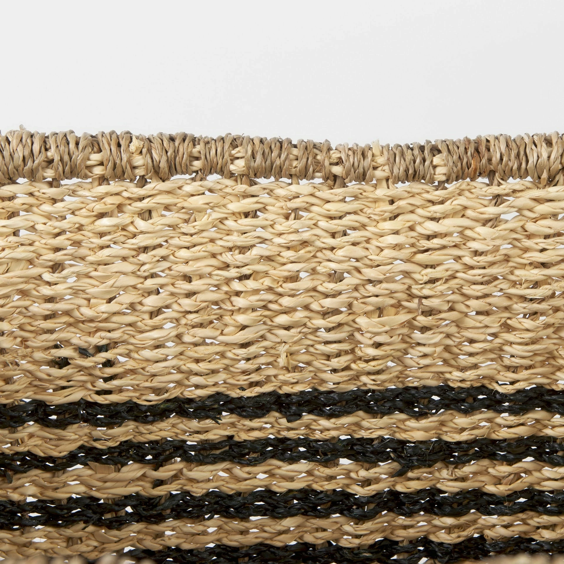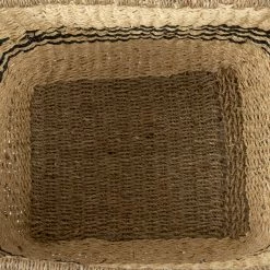 These baskets are finished in a light brown warm tone, with two round handles on either side, and black stripes running through the middle.ย - Tropical Inspired