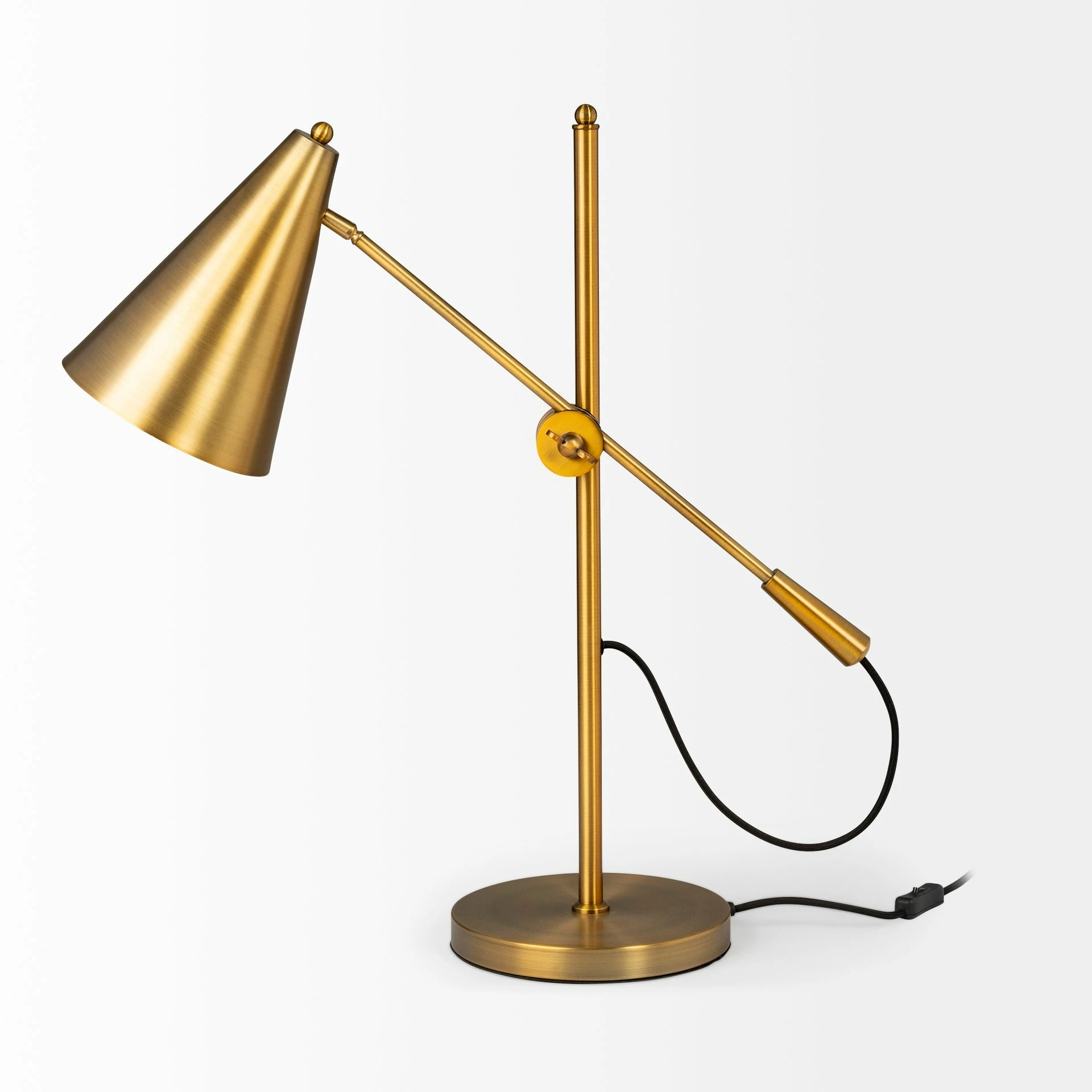 Finished in an antiqued-gold tone, the Fragon I is a spectacular, desk or table lamp that features a conical lamp shade. The stunning lamp shade is affixed to a circular metal base by means of an adjustable, metal beam that makes the Fragon I a functional and versatile piece. The Fragon I uses a 40-Watt, standard E26 bulb (Sold Separately) which can be controlled using the toggle switch on the lamp, for convenient and energy efficient usage. This versatile and visually appealing table lamp looks gorgeous in spaces based on the Enduring Elegance and Industrial design styles.