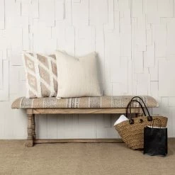 The Greenfield II is a stylish bench that features a four-legged, light-brown finished base made from solid Indian mango wood. Atop the durable mango wood top is a jute covered, perfectly padded seat with intricate patterns in shades of brown and tan. The soft wooden and fabric accents make the Greenfield II a great choice for spaces based on the Global Curiosities design style.ย