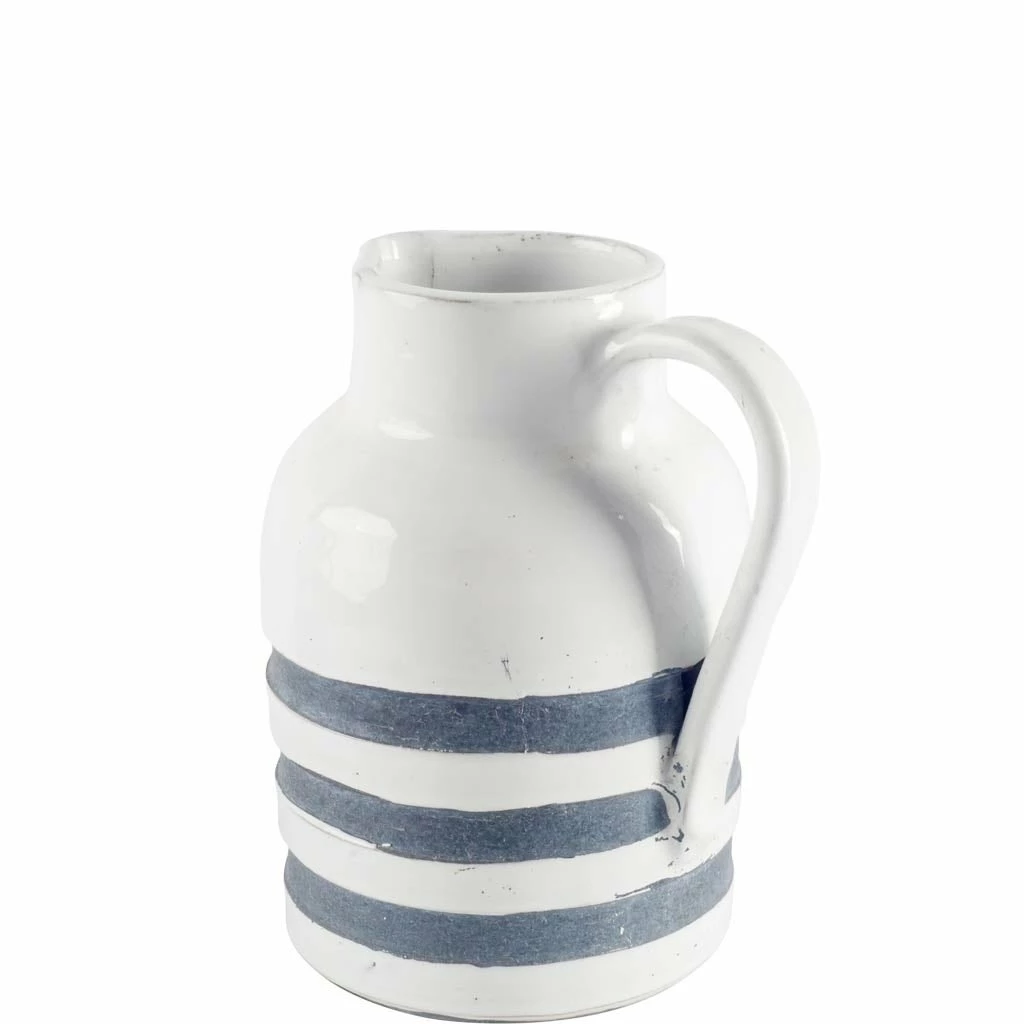 Expertly crafted from ceramic and designed to look like a rustic, weathered water pitcher with a pouring handle, the Harmon I is the smaller of two spectacular decorative vases from the Harmon series. Finished in a rustic white tone with horizontal blue stripes, the Harmon I looks absolutely gorgeous in any space and setting but is most recommended for spaces based on the Farmhouse design style.