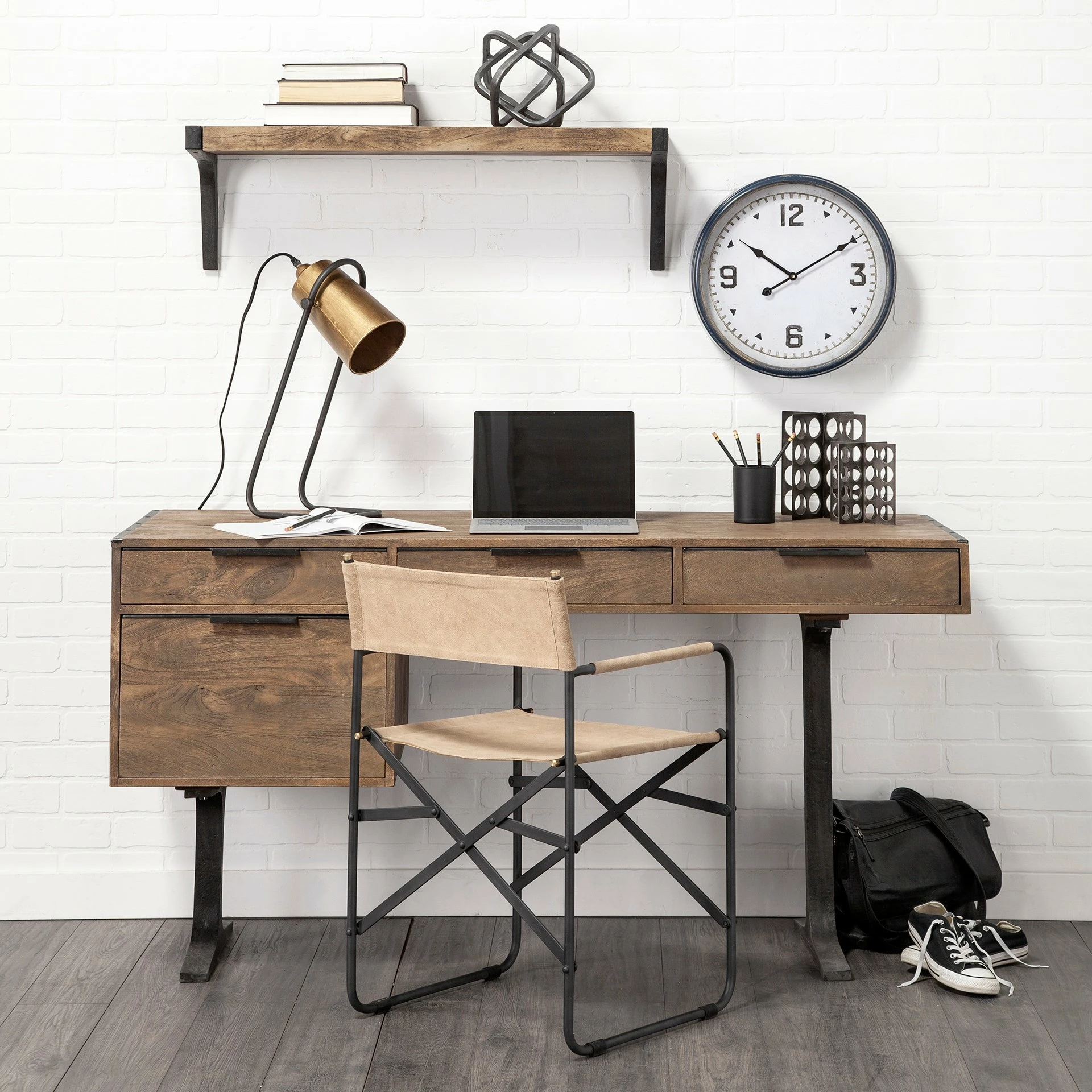 50’s style aesthetics finished in blue with gold distressing. Paper face encased in glass with black metal hands. Uses 1 AA battery (not included).