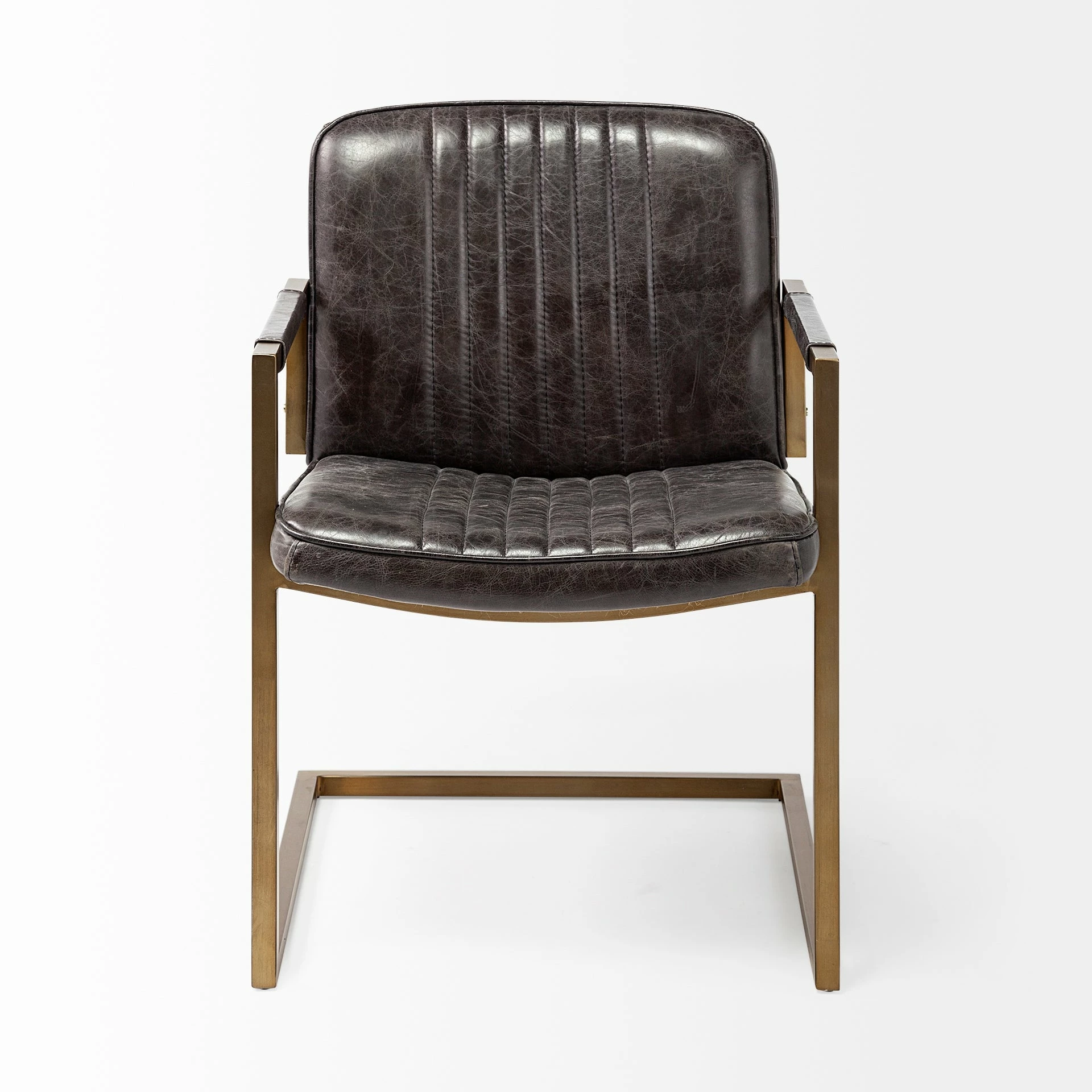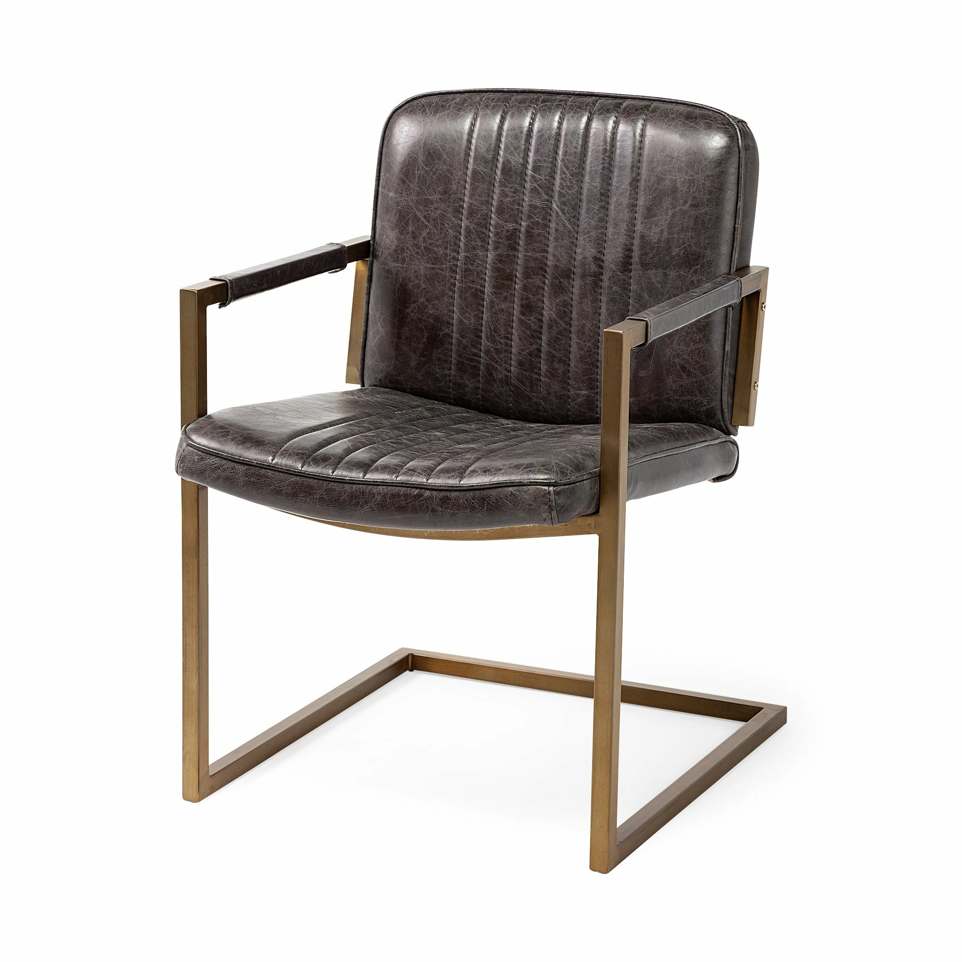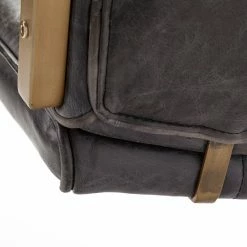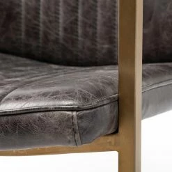 The Horner, a stylish accent chair, sports a top-grain black leather seat with a vertical stitch to it. The seat and back are mounted on a powder-coated, brass metal frame that not only stabilizes the chair but also contributes to its visual appeal. The Horner also comes equipped with armrests wrapped in matching leather that make relaxing on this chair a bliss. The juxtaposition of black leather and antiqued metal as seen on the Horner is what makes it a great pick for spaces based on the Mercana Modern or Industrial design styles. ย