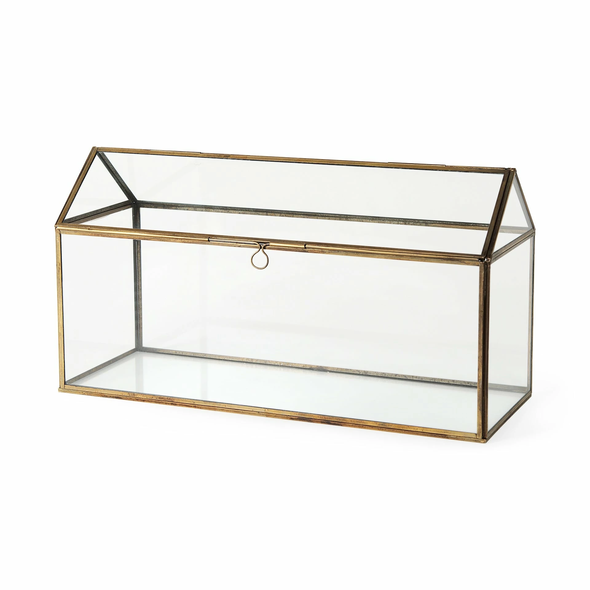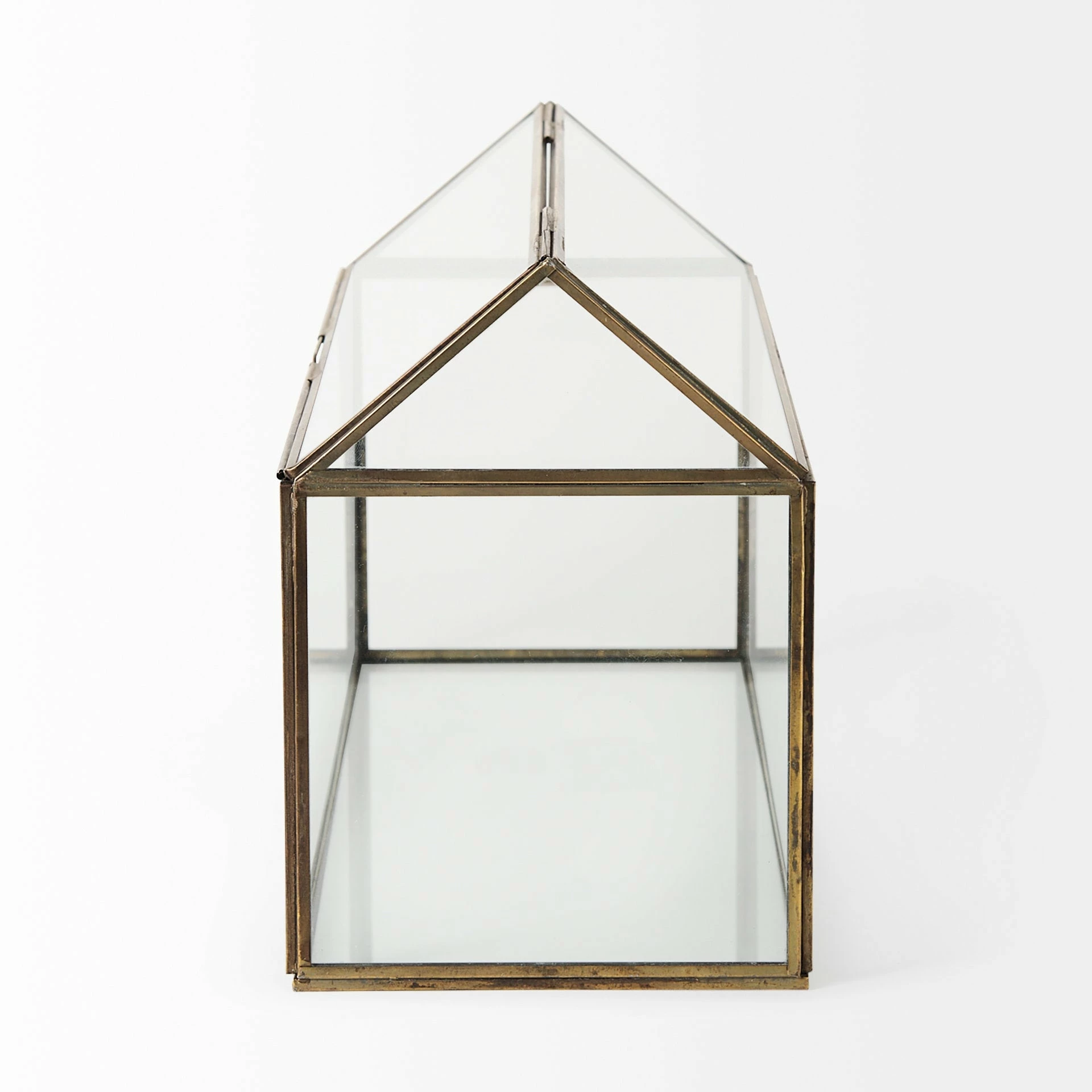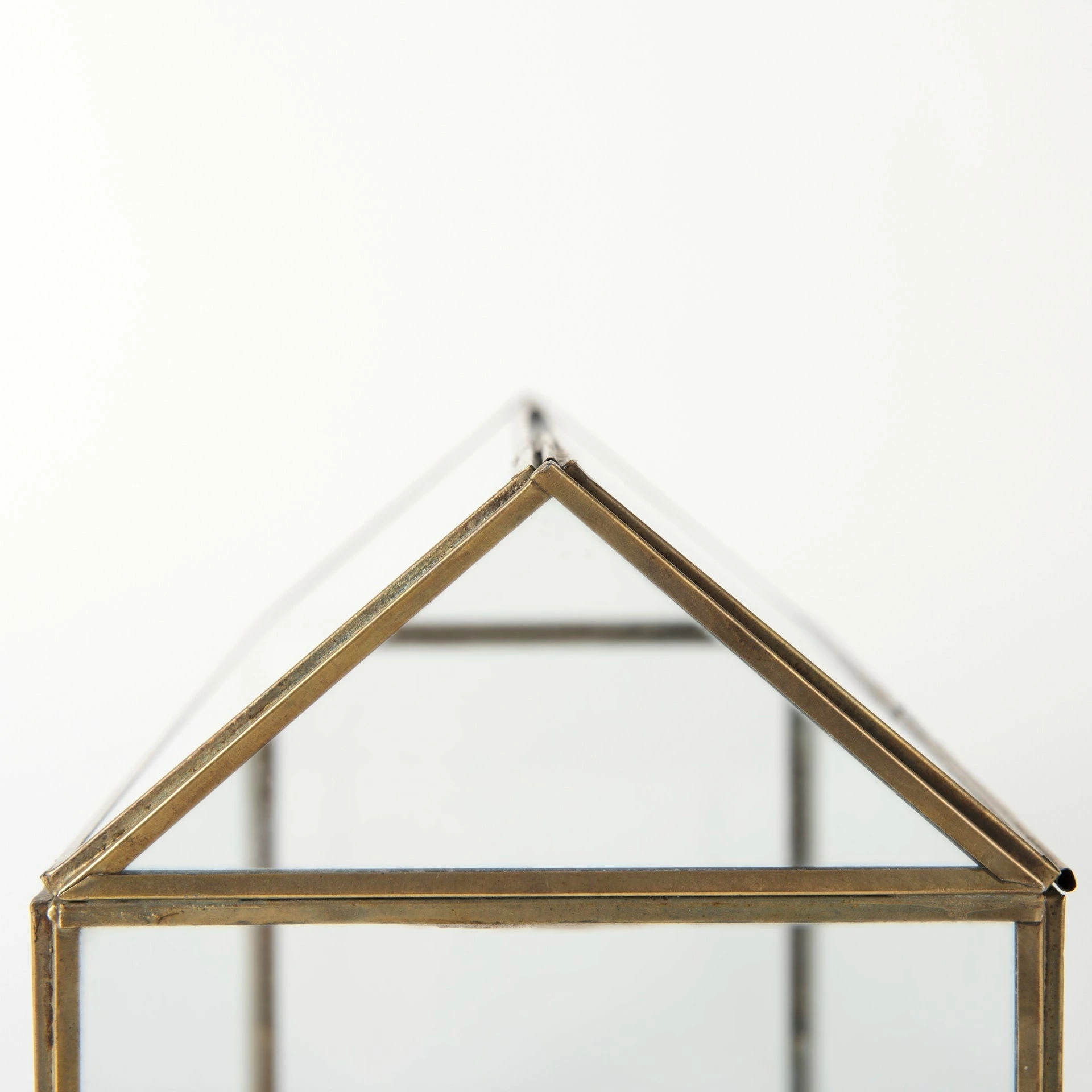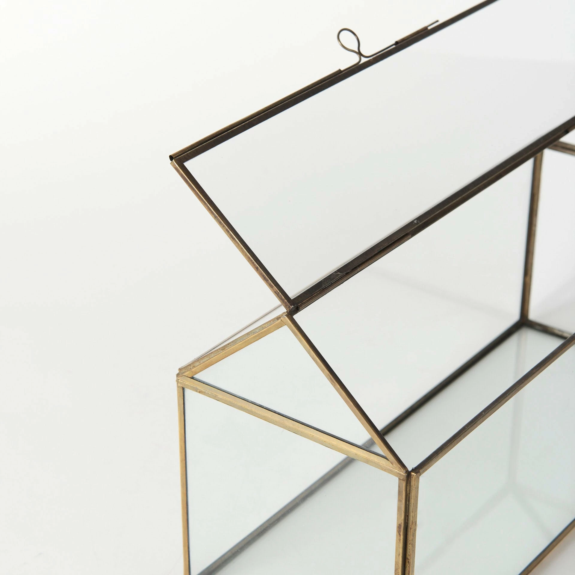 The Hutt is a nifty, house-shaped terrarium/storage box made from clear glass panels with an antiqued gold metal frame. Tabletop Terrarium BoxMeasuring 16.0″ long by 6.0″ wide by 9.0″ high, the Hutt can be displayed neatly on tabletops and shelves. Metal and Glass ConstructionThe Hutt is a geometric, house-shaped terrarium made from clear glass panels and an antiqued gold metal frame. It’s hinged rooftop swings open for easy access and is held closed by a neat little sliding pin. Vintage CharmA rustic gold metal patina gives this piece charming vintage appeal. *As each piece is unique in how it accepts the finishing process, slight variations in color, character and tone should be anticipated. Some pieces may be more rustic than others.Creative Dรฉcor and StorageCreate a mini greenhouse to display succulents, fern moss and air plants, showcase a favorite keepsake or store odds and ends in a creative way. There are so many ways to use the Hutt! Elegant StyleThe Hutt makes for pretty organization, injecting classic elegance and vintage charm into any space!