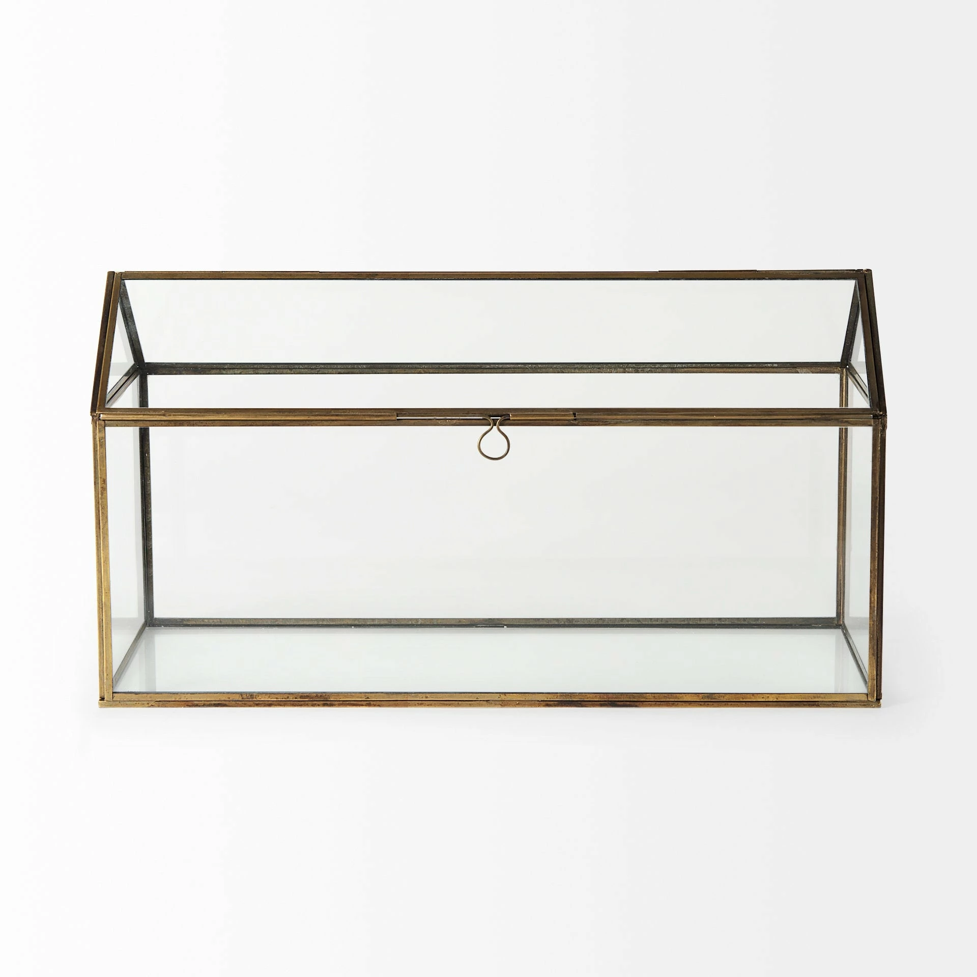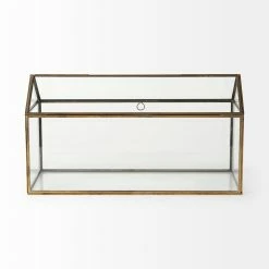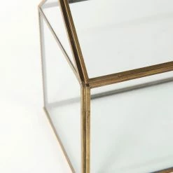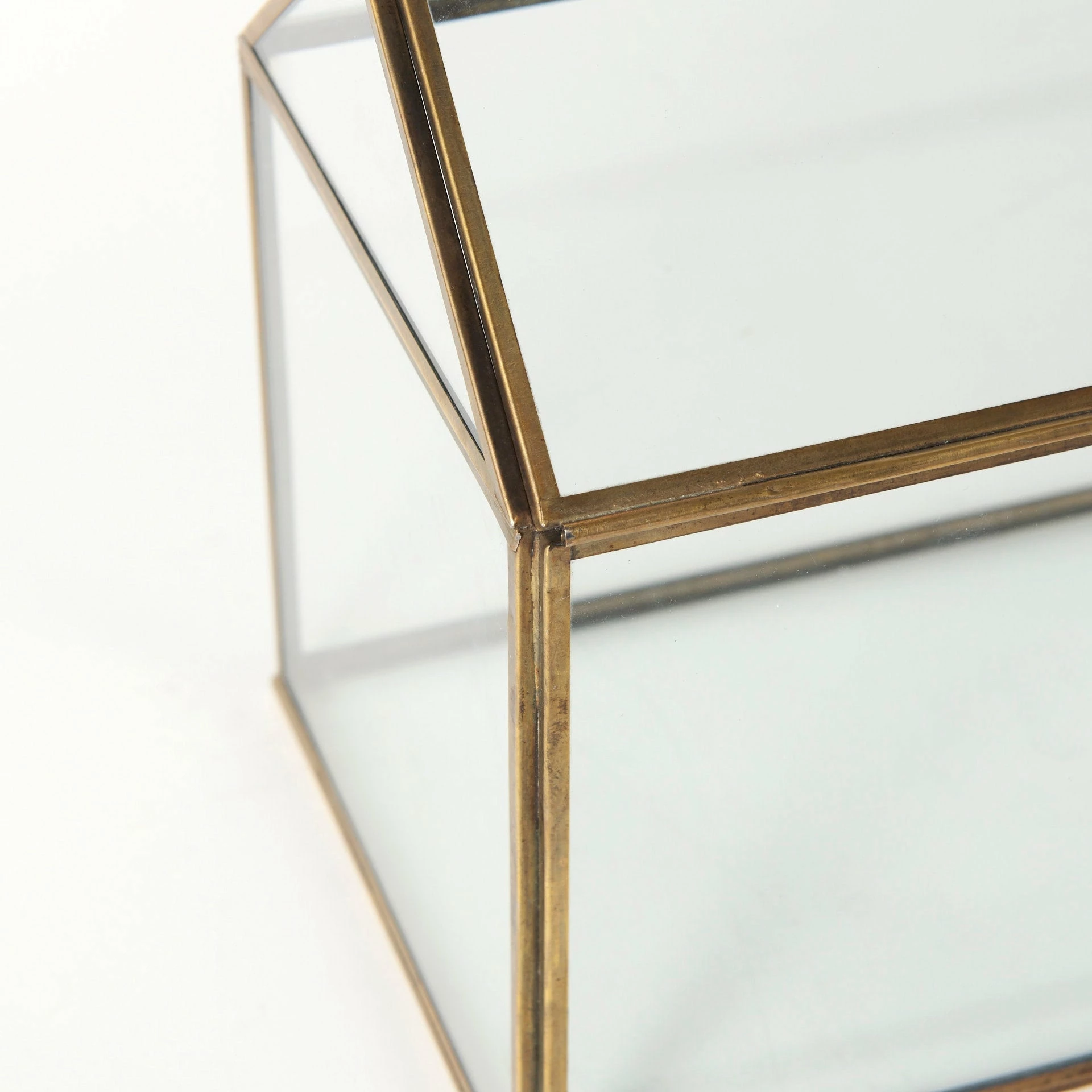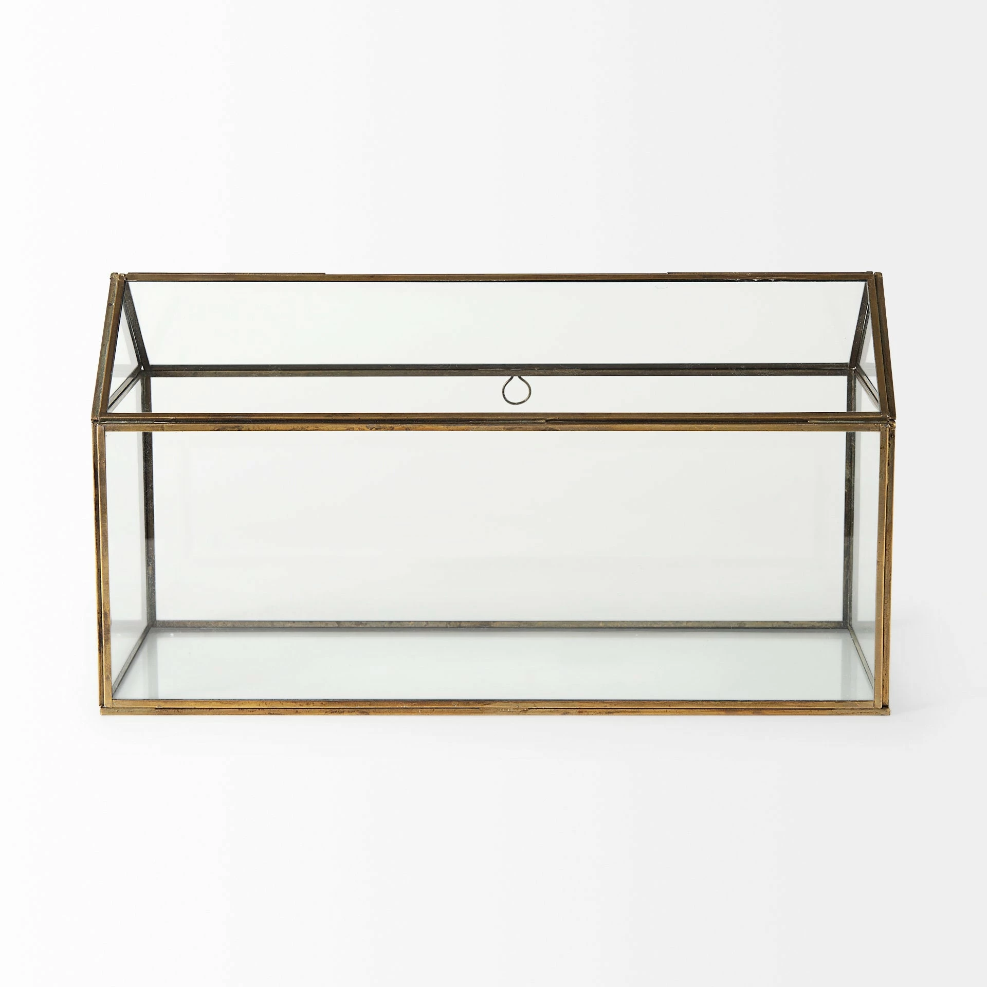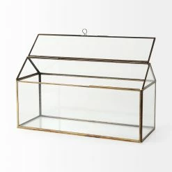 The Hutt is a nifty, house-shaped terrarium/storage box made from clear glass panels with an antiqued gold metal frame. Tabletop Terrarium BoxMeasuring 16.0″ long by 6.0″ wide by 9.0″ high, the Hutt can be displayed neatly on tabletops and shelves. Metal and Glass ConstructionThe Hutt is a geometric, house-shaped terrarium made from clear glass panels and an antiqued gold metal frame. It’s hinged rooftop swings open for easy access and is held closed by a neat little sliding pin. Vintage CharmA rustic gold metal patina gives this piece charming vintage appeal. *As each piece is unique in how it accepts the finishing process, slight variations in color, character and tone should be anticipated. Some pieces may be more rustic than others.Creative Dรฉcor and StorageCreate a mini greenhouse to display succulents, fern moss and air plants, showcase a favorite keepsake or store odds and ends in a creative way. There are so many ways to use the Hutt! Elegant StyleThe Hutt makes for pretty organization, injecting classic elegance and vintage charm into any space!