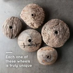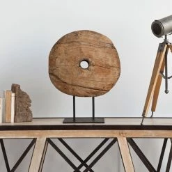 Inspire guests to ponder the origins of this rough-hewn wood accent piece, a salvaged tractor wheel mounted on a metal stand. Each wheel features unique pocks and striations from its journeys through Jodhpur, India, creating a naturalistic look that complements tribal, rustic, or industrial decor.