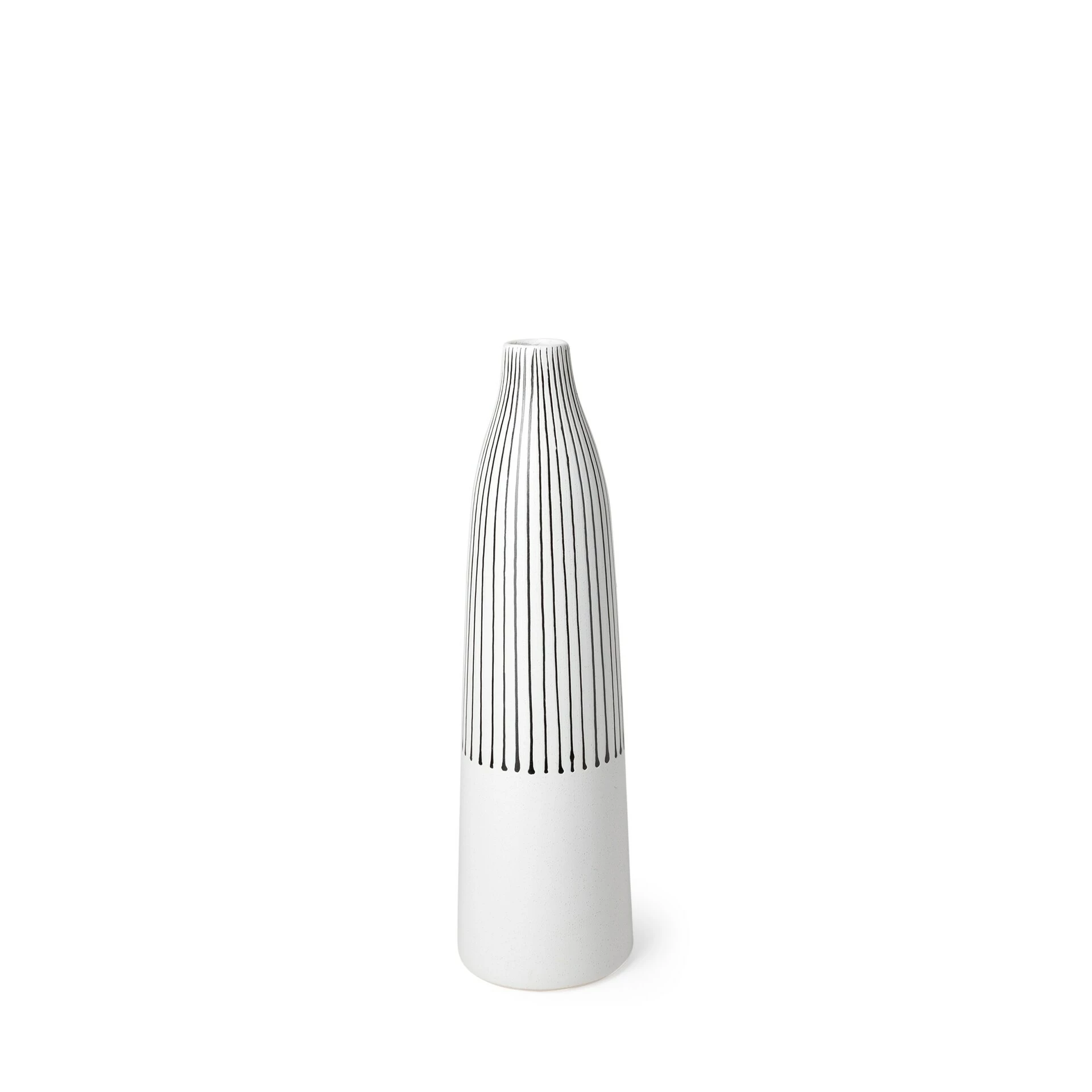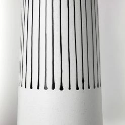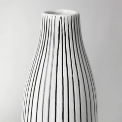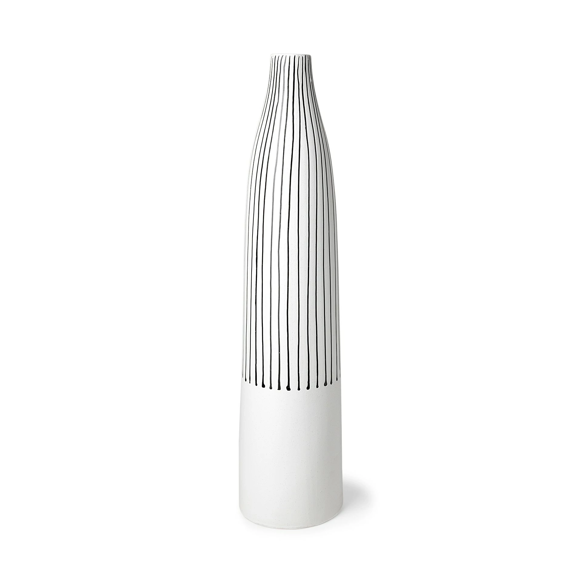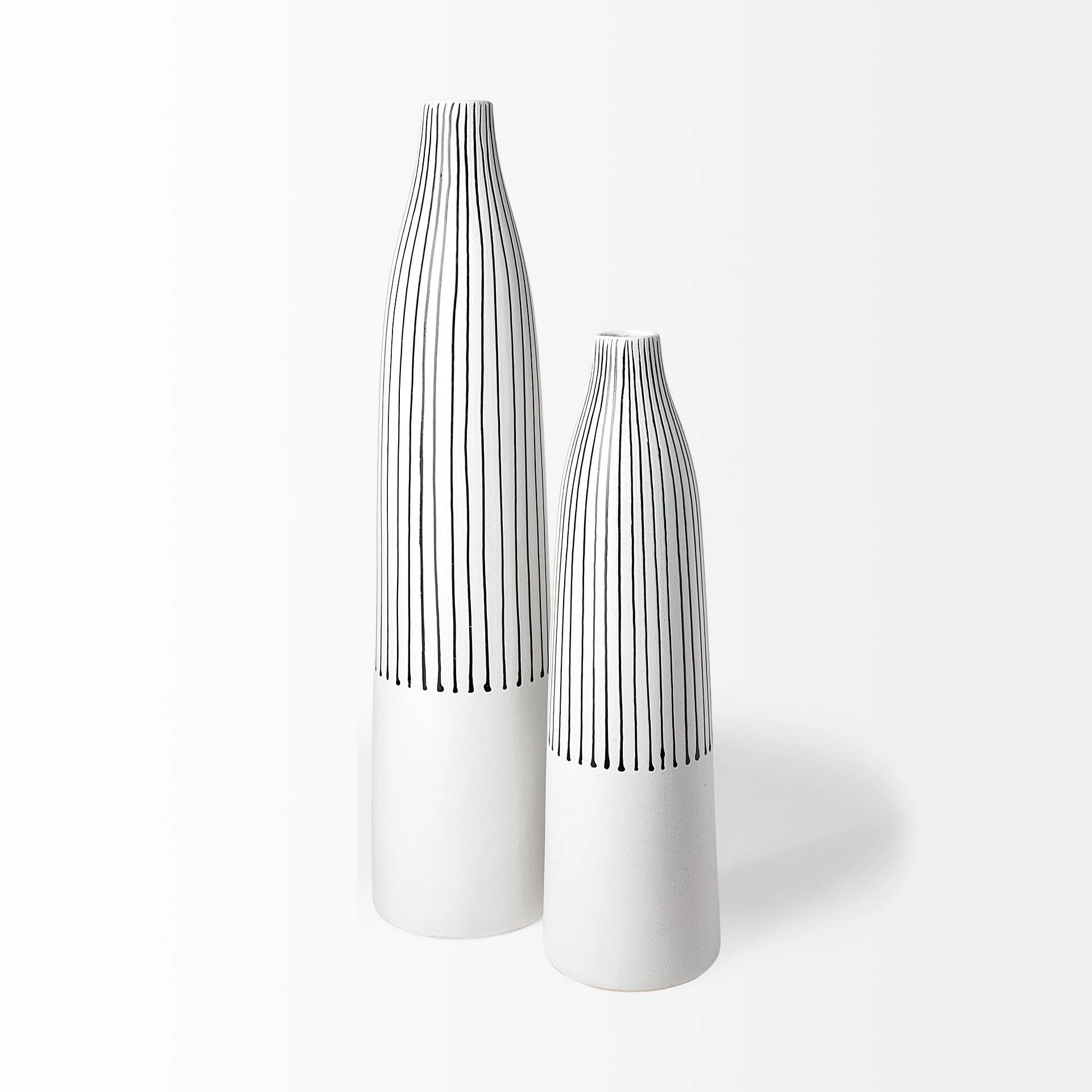 Meticulously crafted from ceramic and finished in a white tone, the Kira I is a chic vase that features a clean, pinstripe pattern in a black tone. It looks great by itself or when paired with others from this series, especially in spaces based on the Mercana Modern design style.ย Ceramic Body| The Kira I is expertly handcrafted from ceramic and is a substantial decor piece that does not easily chip and wear.ย Unique Finish| Finished in aย white tone with a clean pinstripes pattern in a black tone on it,ย the Kira Iย fits well in most contemporary spaces and adds a touch of elegance to them.ย ย Noteworthy Design| With a narrow neck and beautifully finished, tapering body, the Kira I is guaranteed to be a hit in any space especially when paired with the other variant from the Kira series.ย ย Two Sizes| The Kira series comprises ofย twoย variants: Kira I – 5″ x 5″ x 17.8″, Kira II – 5.1″ x 5.1″ x 22.8″ย