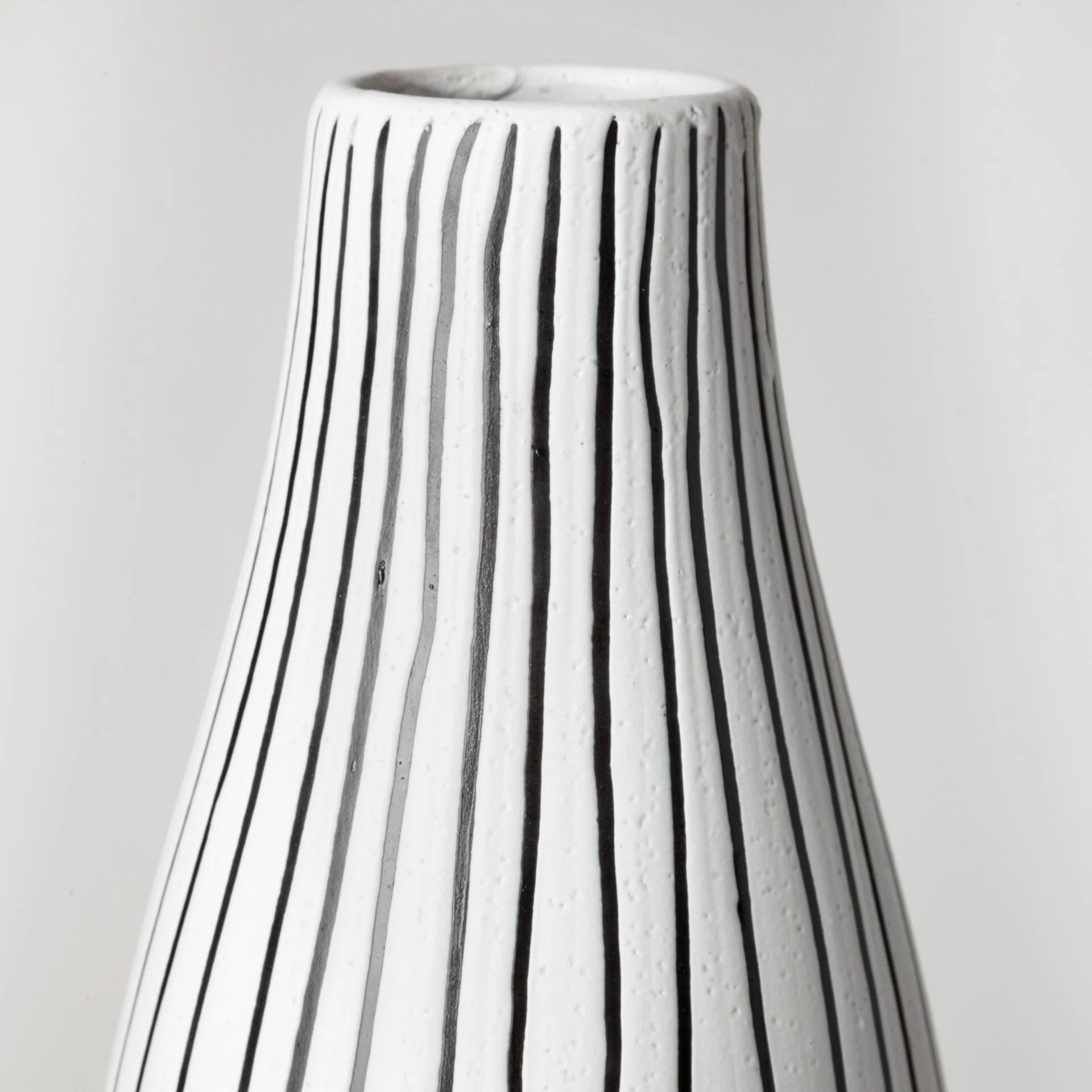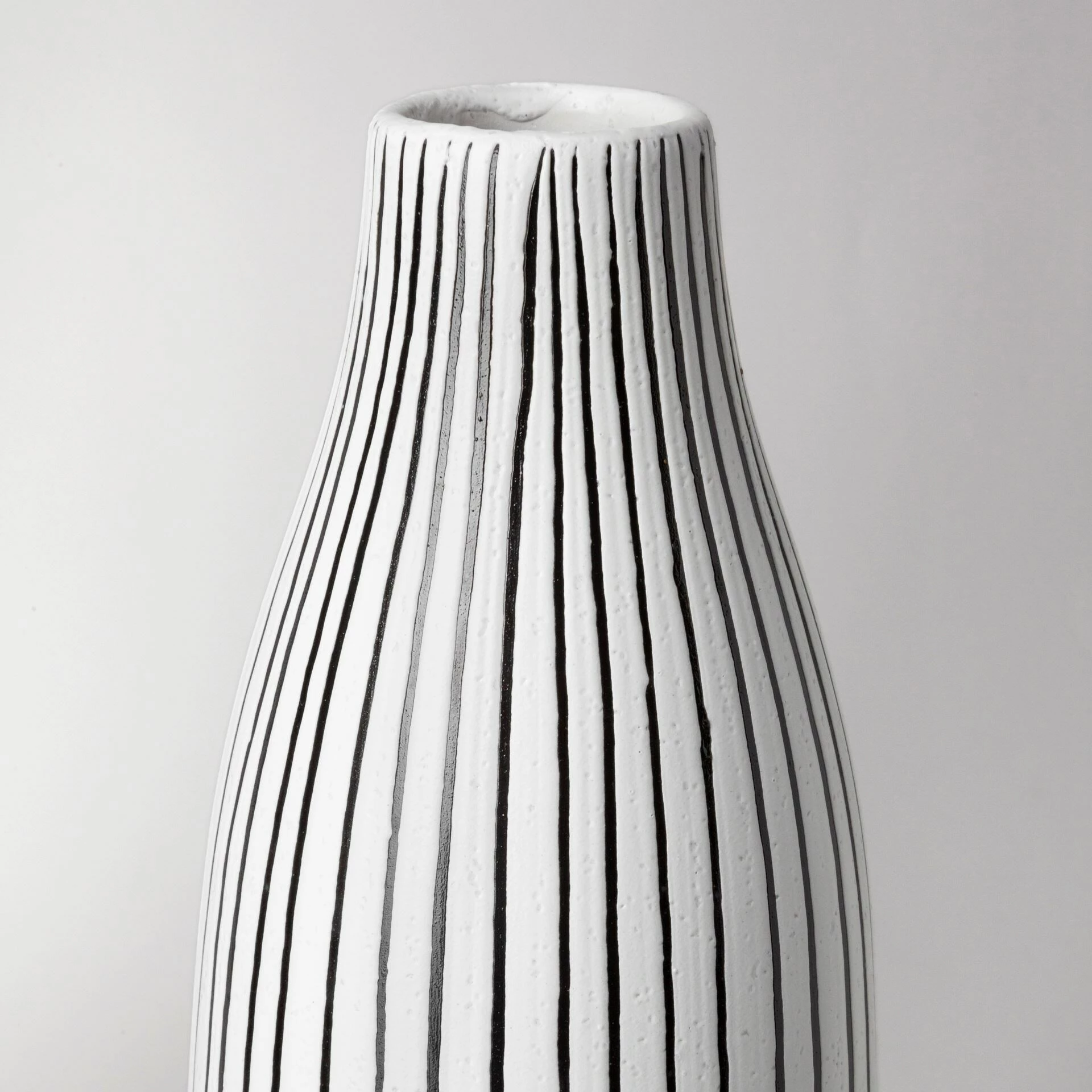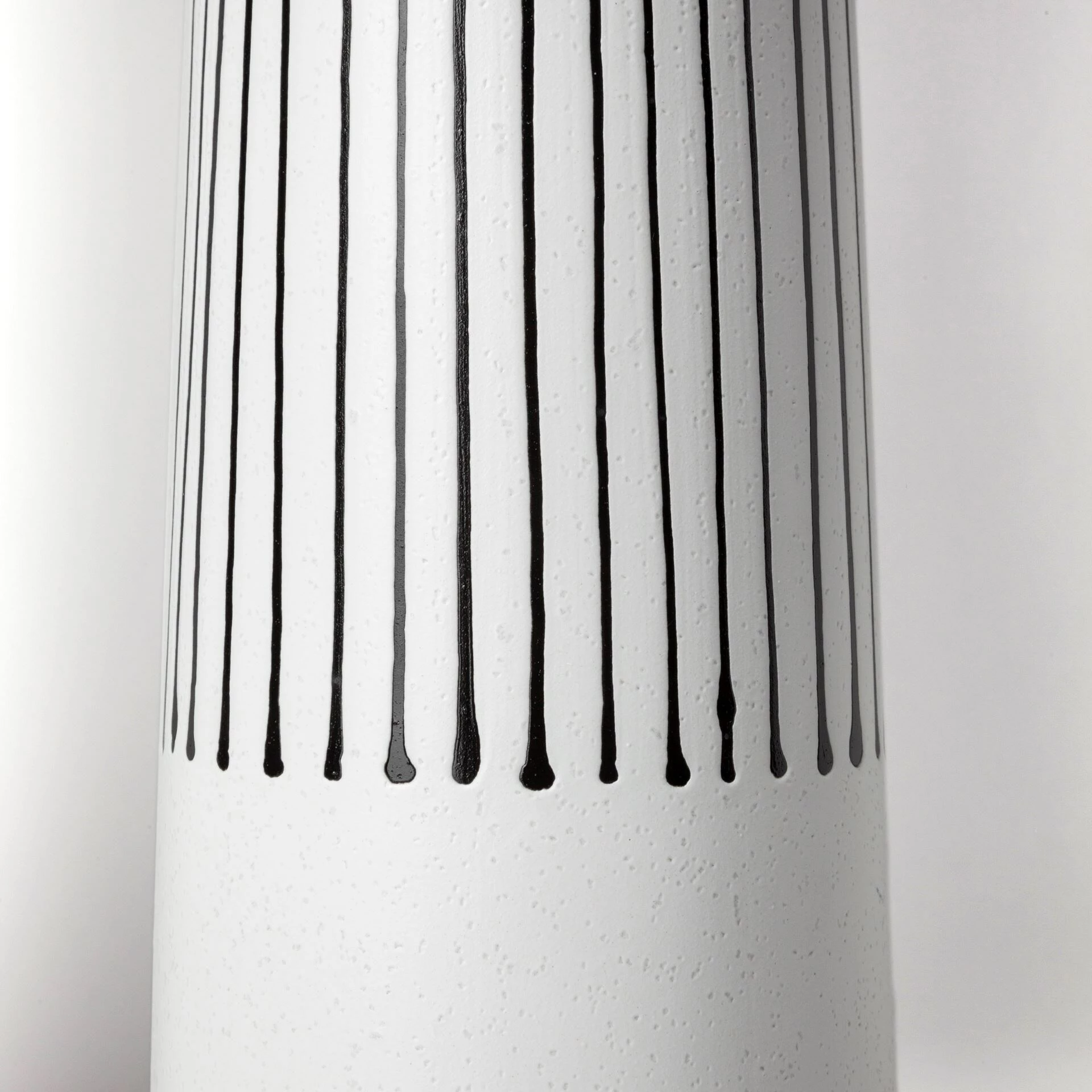 Meticulously crafted from ceramic and finished in a white tone, the Kira I is a chic vase that features a clean, pinstripe pattern in a black tone. It looks great by itself or when paired with others from this series, especially in spaces based on the Mercana Modern design style.ย Ceramic Body| The Kira I is expertly handcrafted from ceramic and is a substantial decor piece that does not easily chip and wear.ย Unique Finish| Finished in aย white tone with a clean pinstripes pattern in a black tone on it,ย the Kira Iย fits well in most contemporary spaces and adds a touch of elegance to them.ย ย Noteworthy Design| With a narrow neck and beautifully finished, tapering body, the Kira I is guaranteed to be a hit in any space especially when paired with the other variant from the Kira series.ย ย Two Sizes| The Kira series comprises ofย twoย variants: Kira I – 5″ x 5″ x 17.8″, Kira II – 5.1″ x 5.1″ x 22.8″ย