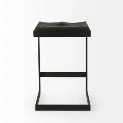 This modern counter stool features a Mango wood seat that rests on an iron frame in a C-shape design. A footrest is neatly incorporated into the base and the seat is gracefully indented to provide additional comfort, while keeping with its minimal aesthetic.ย - Black Finish