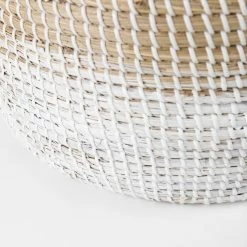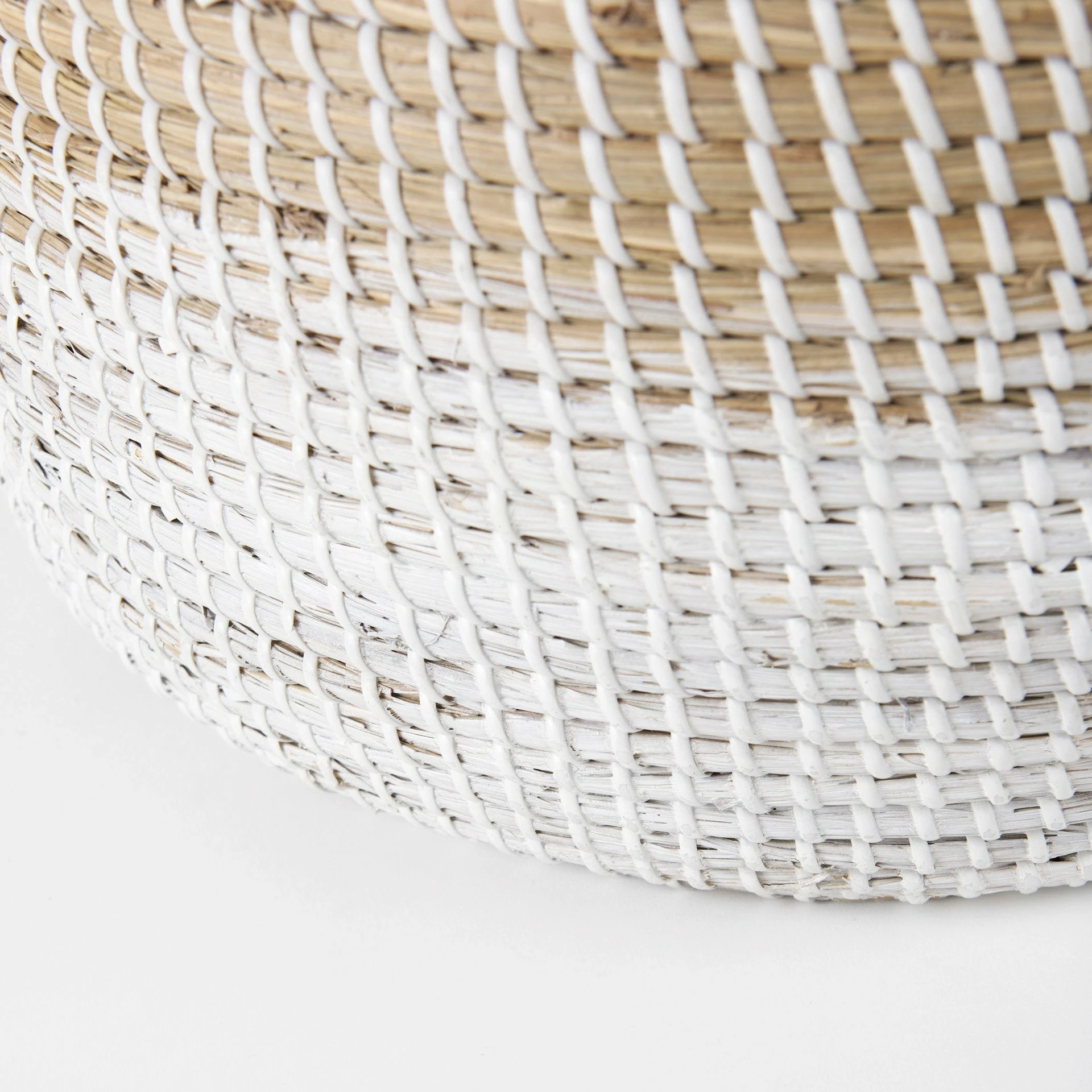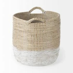 The Maddie baskets measure 13.8L x 13.8W x 15.0H. The Maddie baskets are carefully crafted in a woven pattern, and are finished in a light brown warm tone, with white dipped bottoms. These baskets give the feeling of being somewhere warm and tropical, with their beautiful weaving detail and warm toned colors, they suit coastal and tropical styled spaces and are a instant head turner.