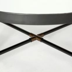 This coffee table features a tray-like, mirrored top supported by a crossed metal base. - Black and Brass Finish
