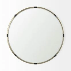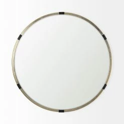 A round mirror with a timeless, yet modern sophistication. 23.6″ Round MirrorThe Melissa mirror measures 23.6″L x 1.8″W x 23.6″H.Metal and Mirror ConstructionClean lines and a simple design, this round mirror is edged by a slender iron frame with four clamp-like embellishments that add a little texture and interest. Gold and Black FinishThe frame’s champagne gold finish, with black metal accents, has a timeless, yet modern sophistication.Versatile FunctionUse to make spaces appear larger, bounce light, reflect views, fill empty spaces, add texture, or just bring in an element of dΓ©cor – the possibilities are endless! Elegantly ModernThis piece is the perfect way to add a touch of modern elegance to any space!