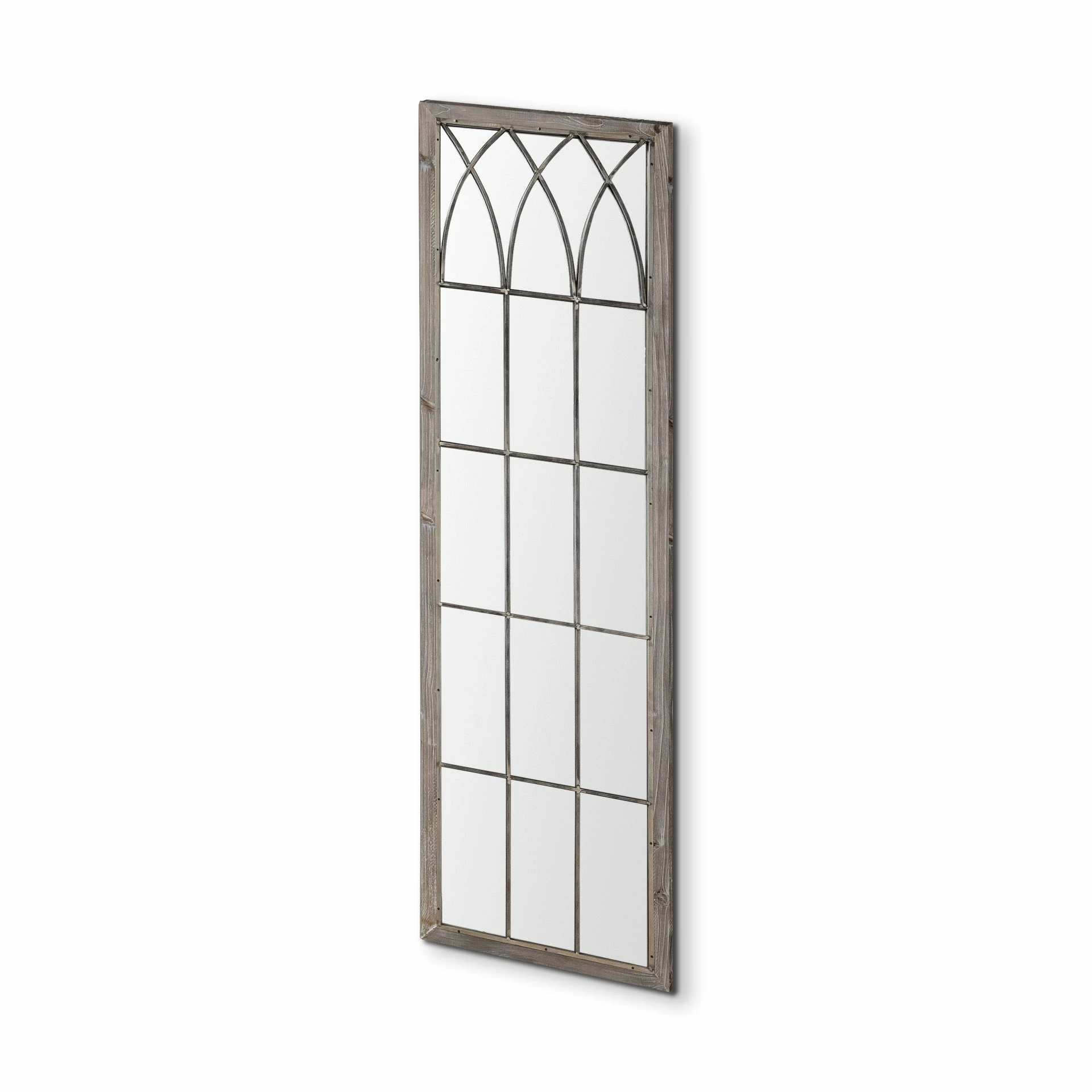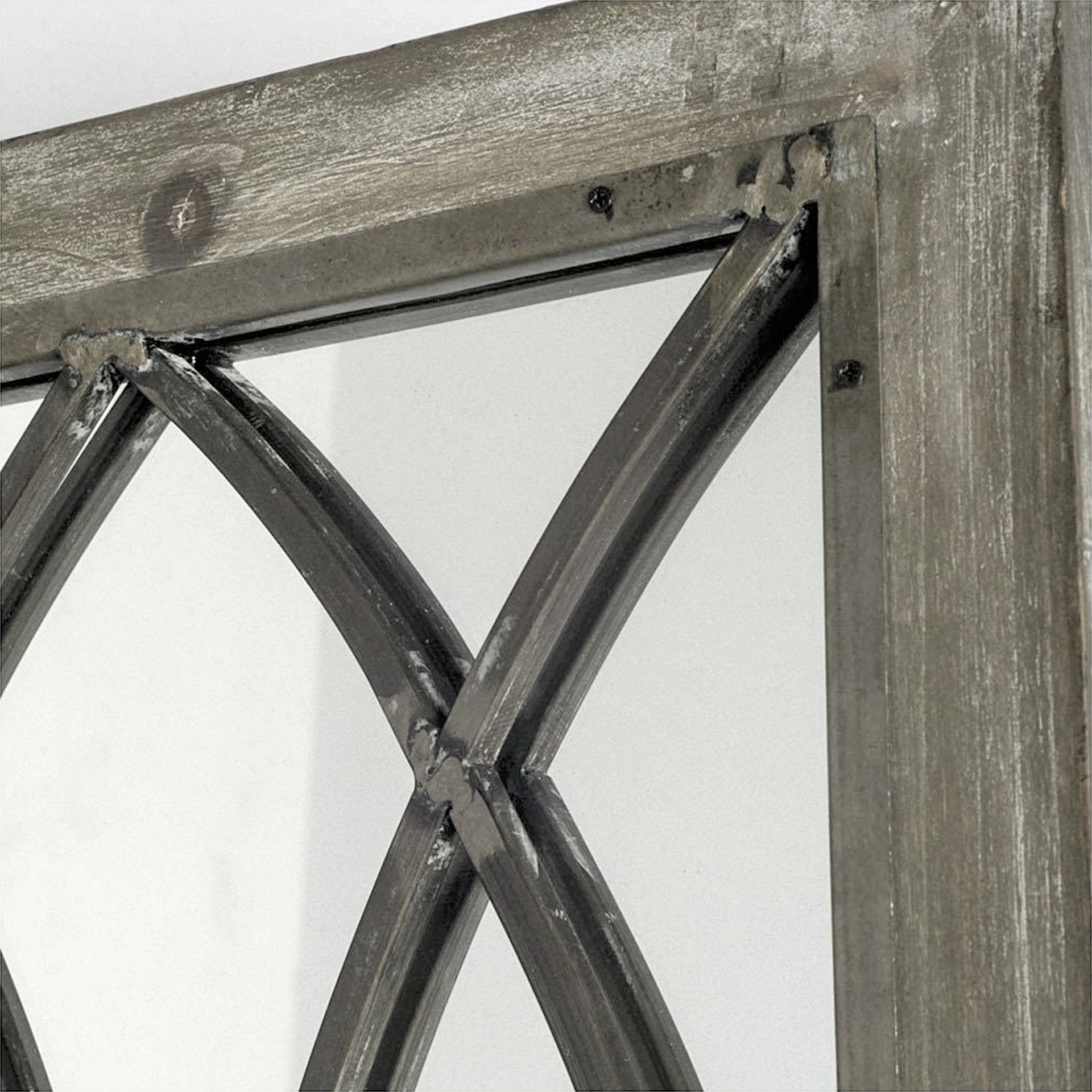 This majestic wall mirror is beautifully designed with a solid weathered wood frame with mid-century inspired welded iron details.
