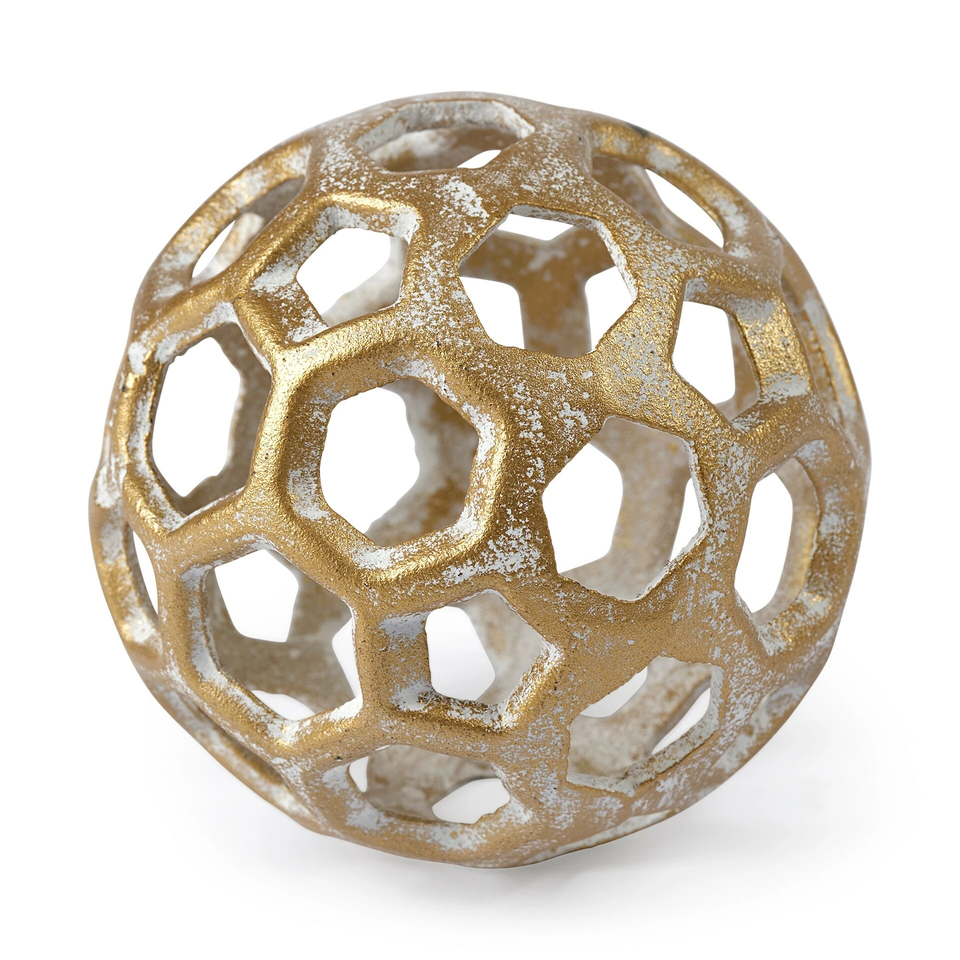 Crafted from metal finished in a whitewashed-gold polish, the Moyer I is a hollow, decorative orb with hexagonal cutouts. It looks great by itself or when paired with the Moyer II, especially in spaces based on the Enduring Elegance or Industrial design styles.