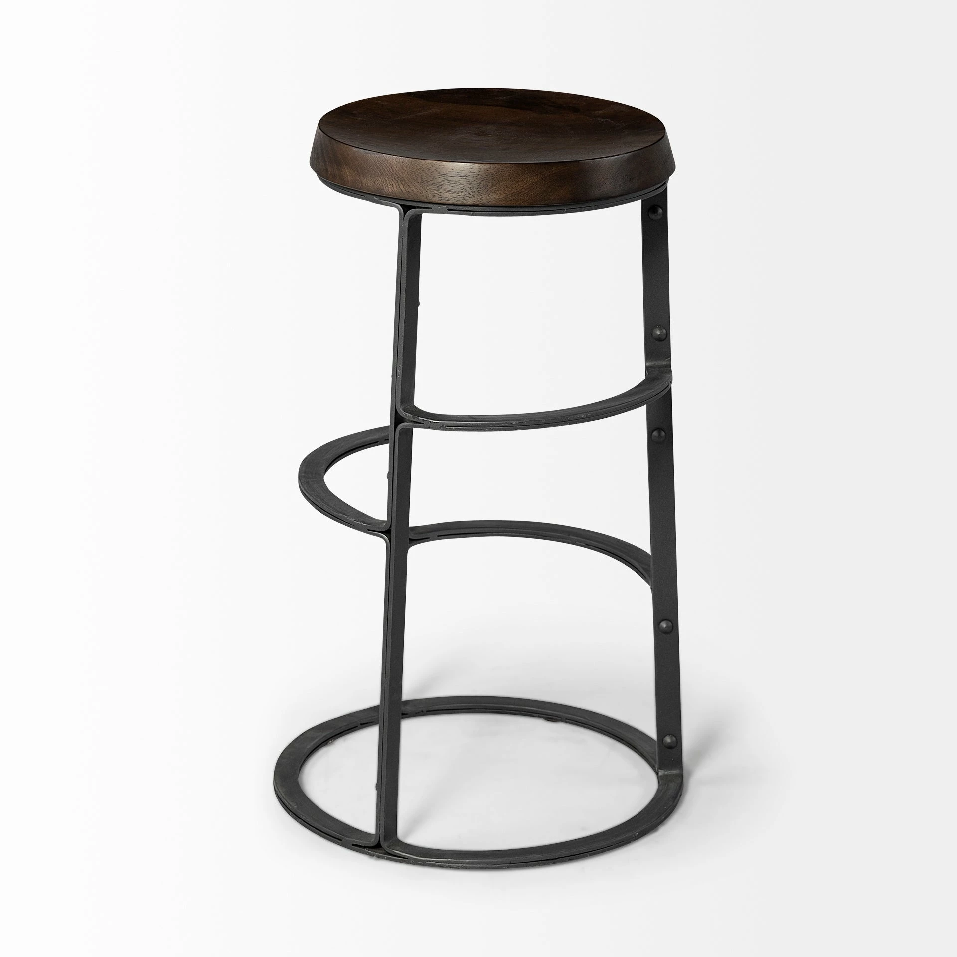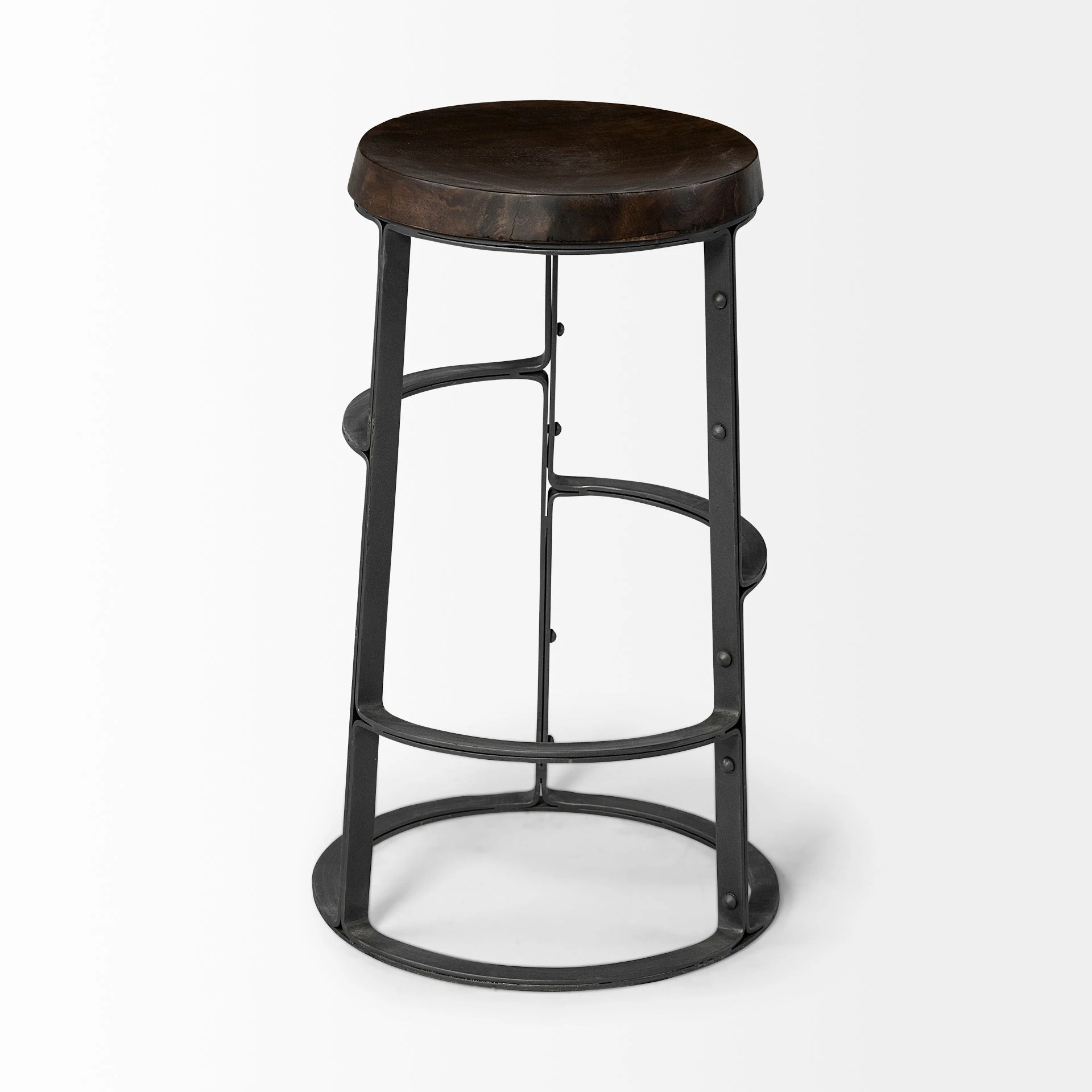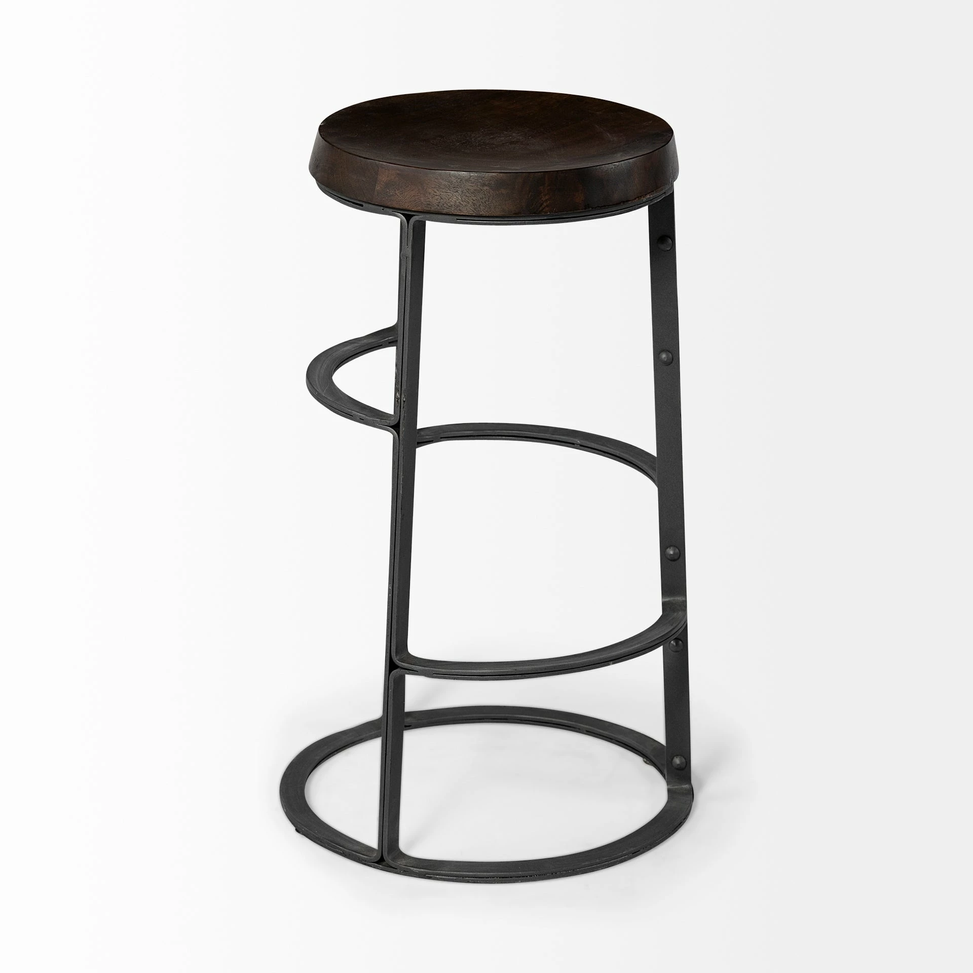 Featuring a round, contoured seat made from dark-stained solid Indian mango wood, The Neo II is a stunning counter-height stool. The solid wood seat is mounted on a uniquely designed iron base finished in a matte black tone. The Neo II, when paired with the right pieces, fits great in spaces based on the Industrial and Woodlands design styles.