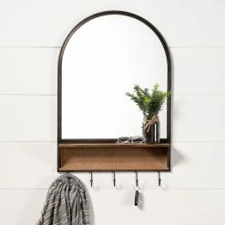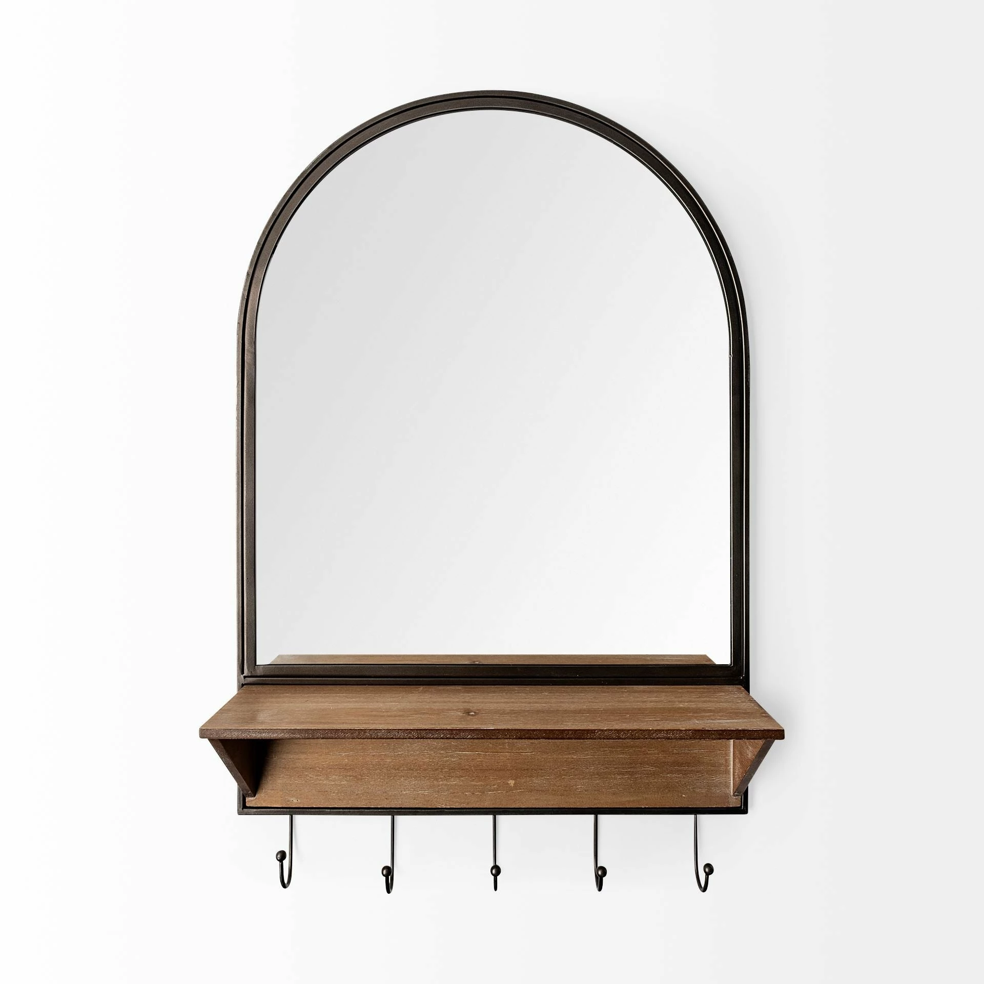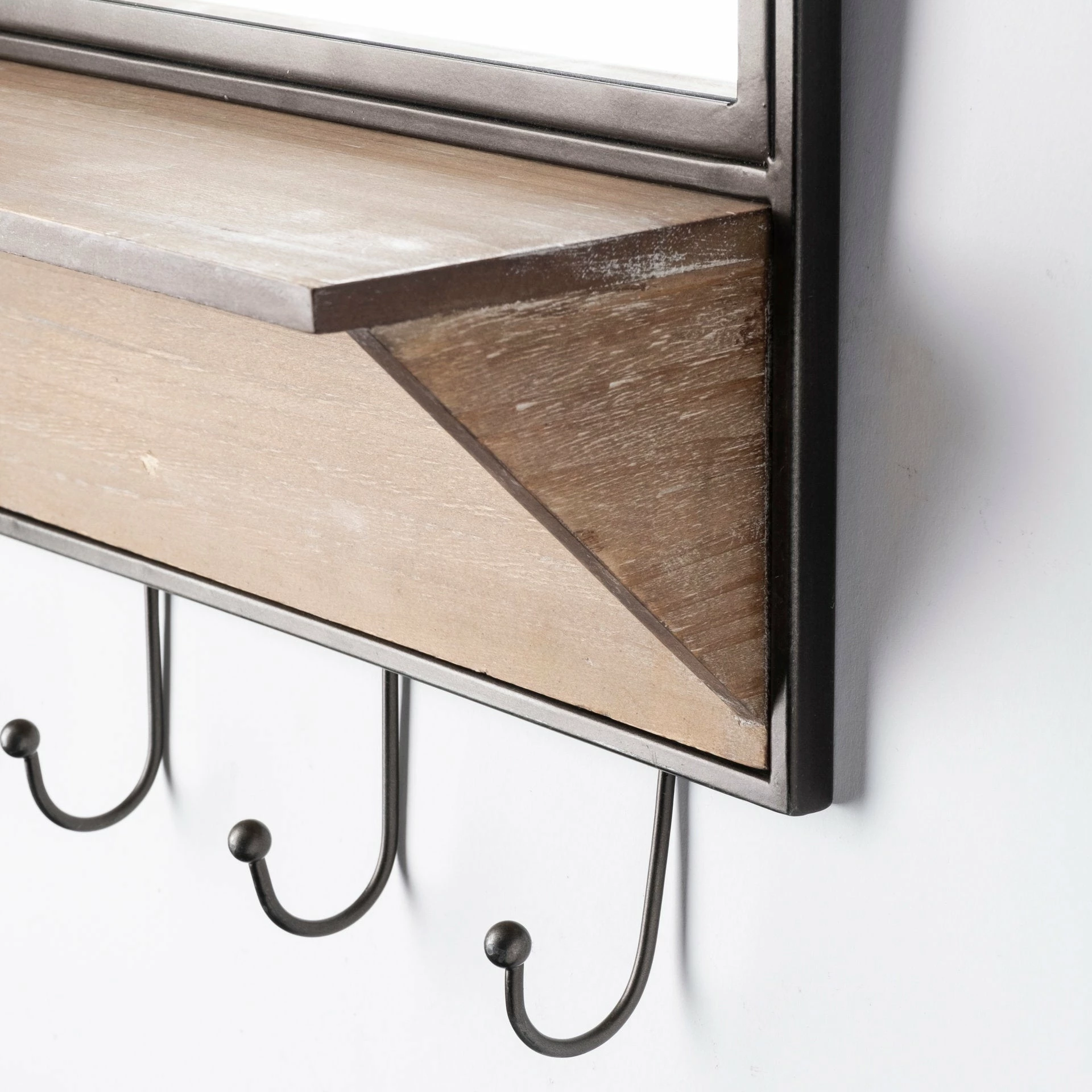 Crafted from metal and wood, the Neville is a stunning, oval-shaped wall mounted mirror featuring a shelf in addition to five hooks that can host keys and other small artifacts. The Neville flaunts a minimal design that ensures it is a good fit in any space and setting.