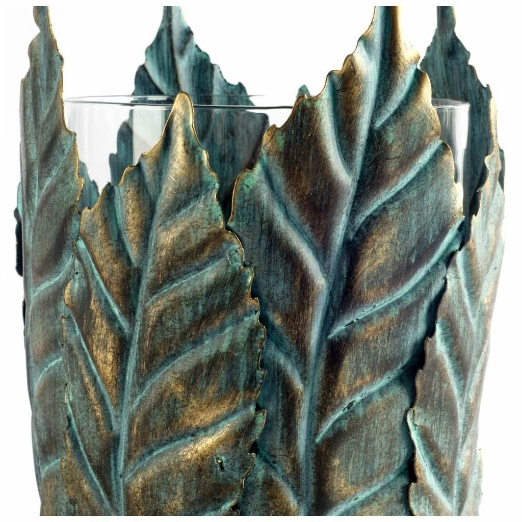 Circular metal leaf candle holder with glass hurricane cylinder. (Candles not included)