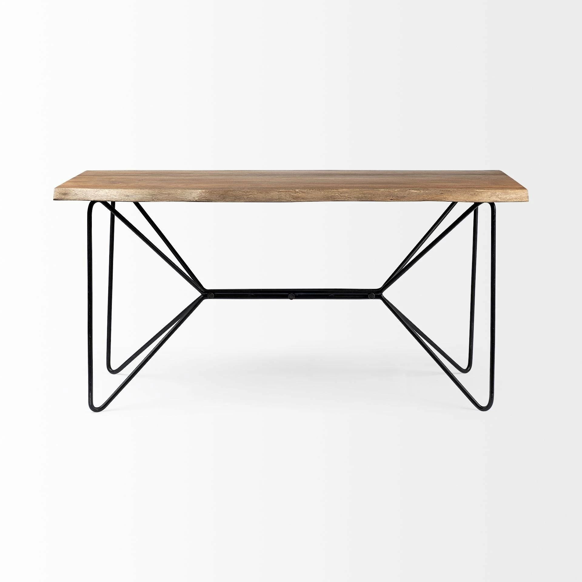 The Papillion IV is a ritzy desk that sports a live edge top crafted from durable Indian Acacia wood finished in a medium-brown tone. The wooden top is supported by a unique, matte-black iron base, shaped like the wings of a butterfly that not only stabilizes the table but also adds to its visual appeal. The Papillion IV fits perfectly in spaces based on the Lakeside, Woodlands and Mercana Modern design styles.