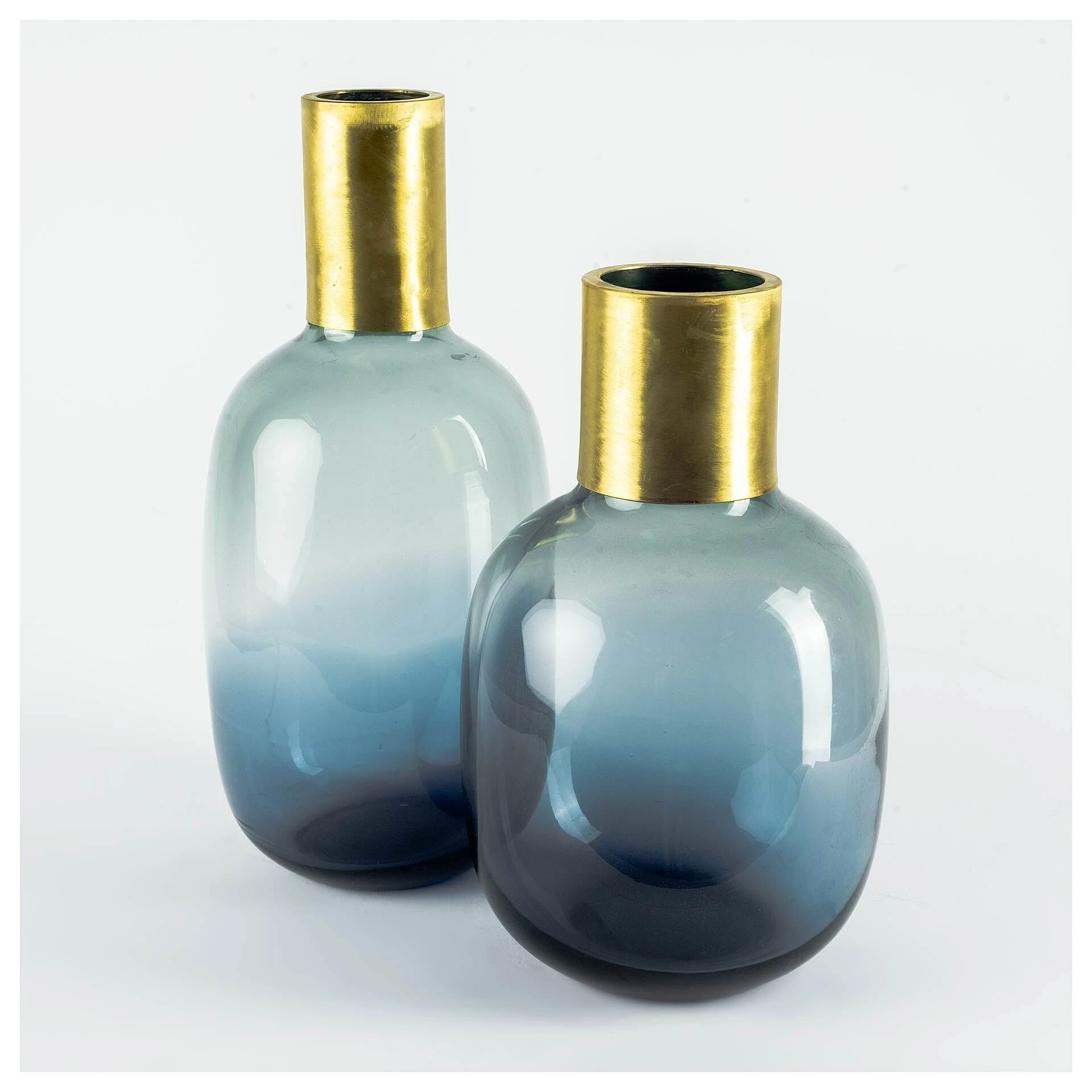 The Parksville pairing of glass vases with brass metal ring tops are truly stunning, featuring an amazing array of blue.