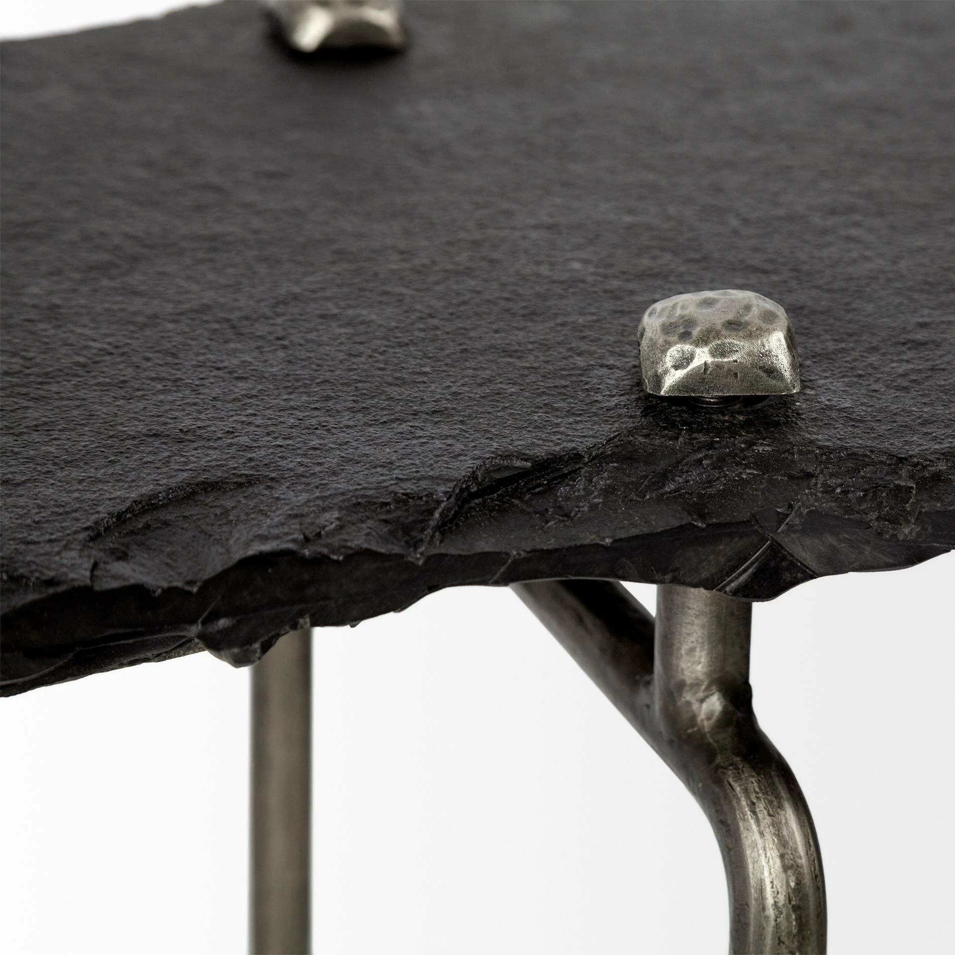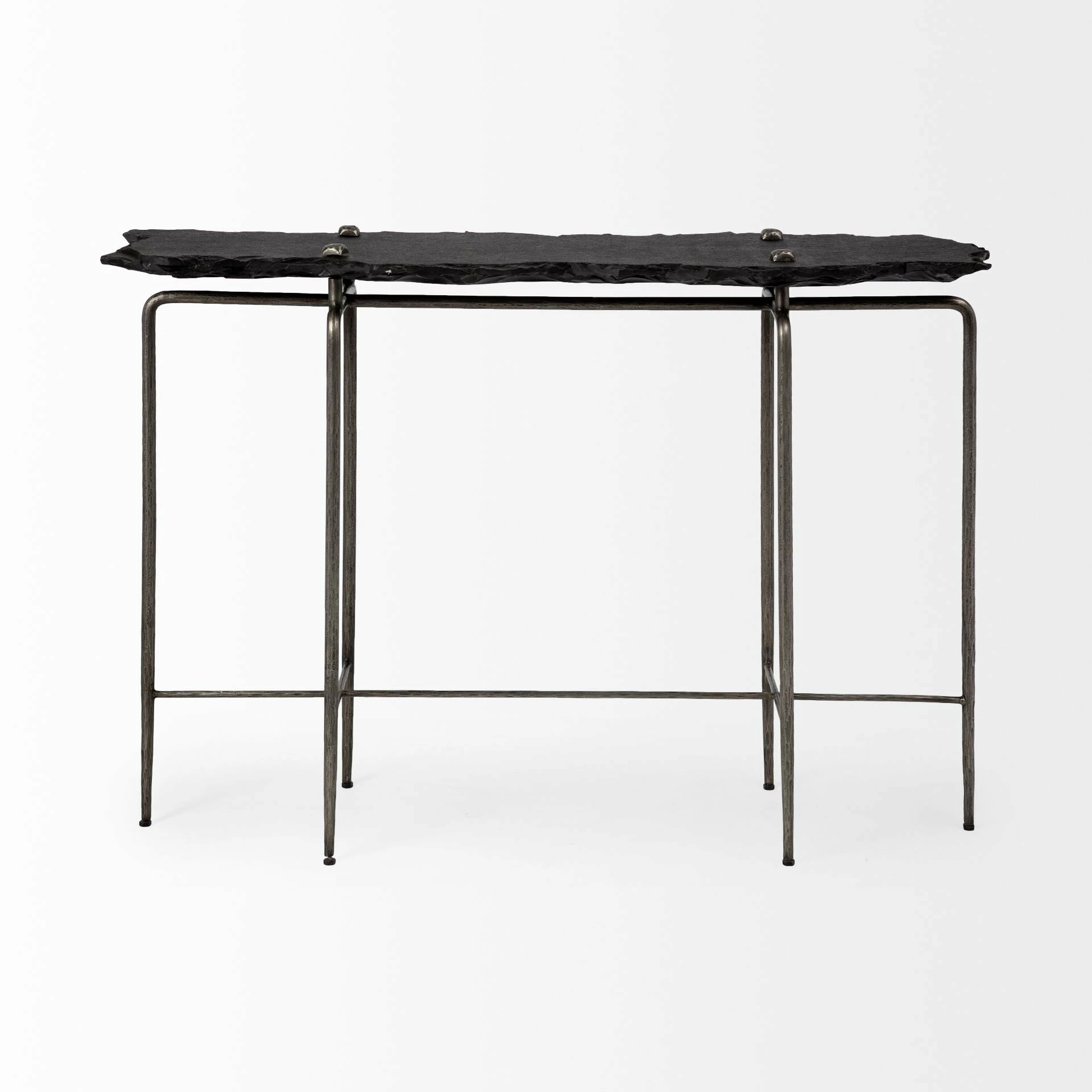 Pinera is a console table with a 6 legged natural iron frame that supports a stunning slab of black slate, with its natural edges and is capped with 4 distressed metal bolts to secure it to the base. *Measurements are approximate.