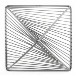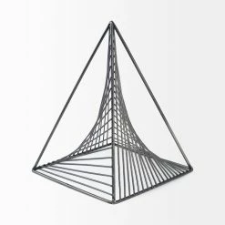 The Risley is an industrial-inspired decorative object that can be described as a hollow metallic triangle finished in a gunmetal grey tone with geometric, spiral details.