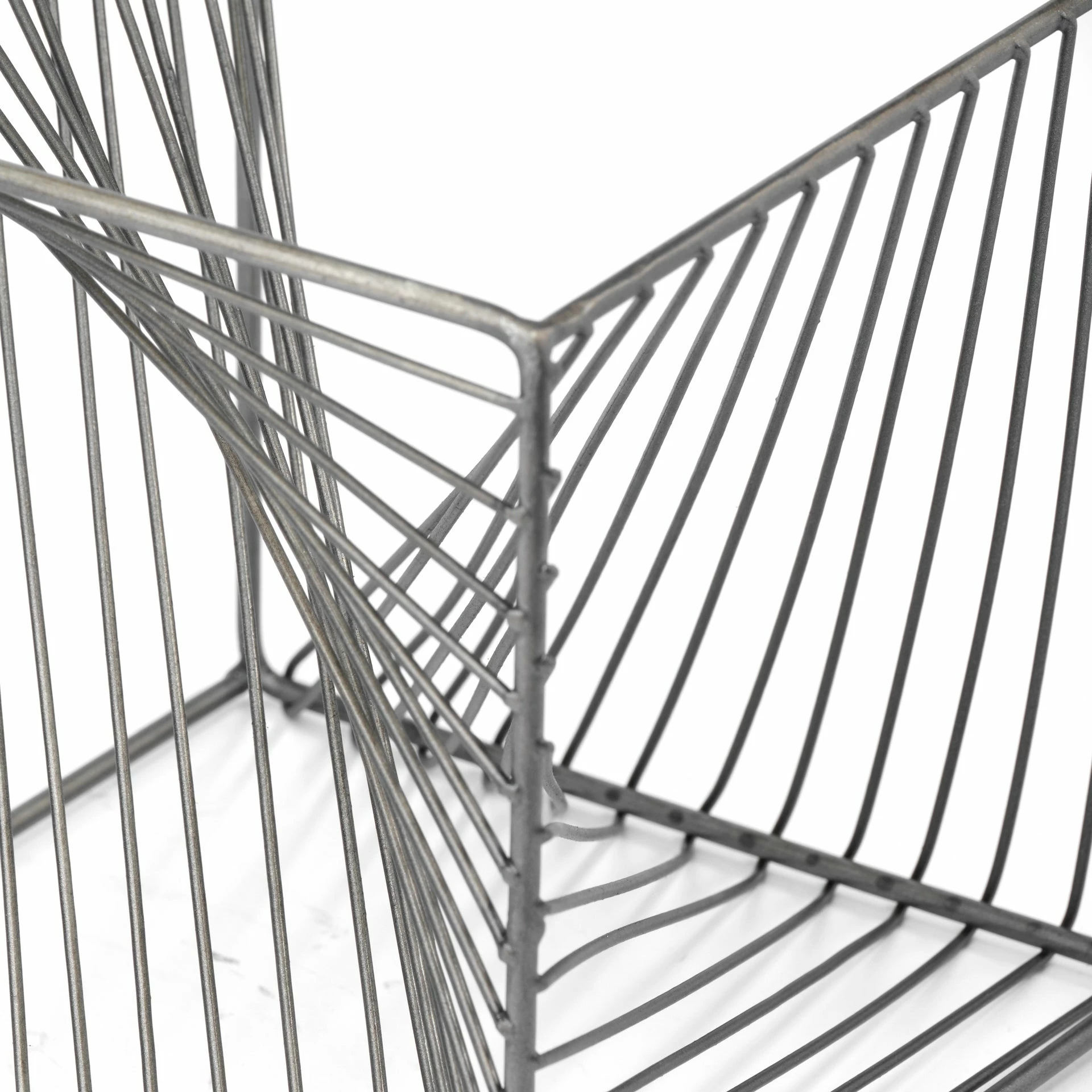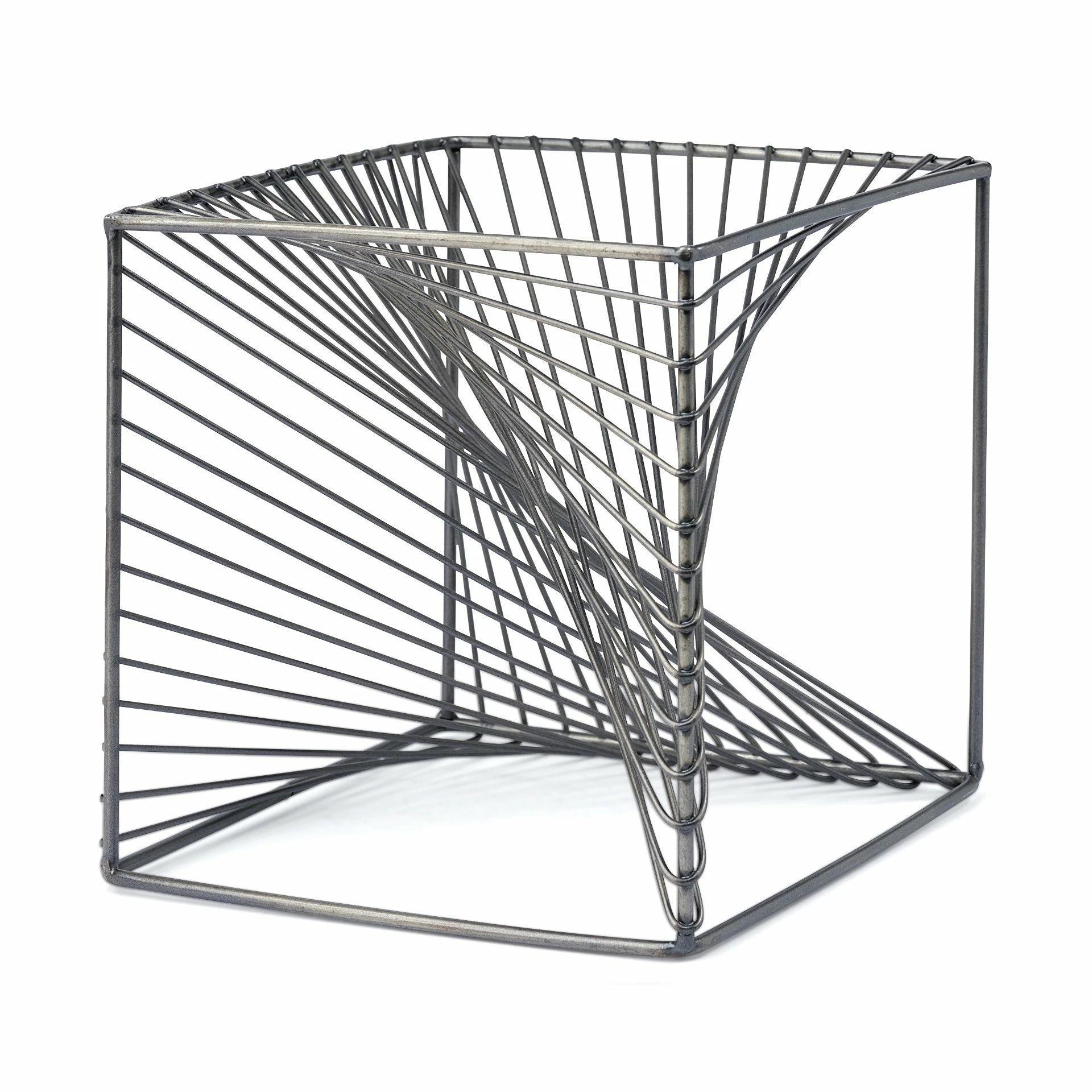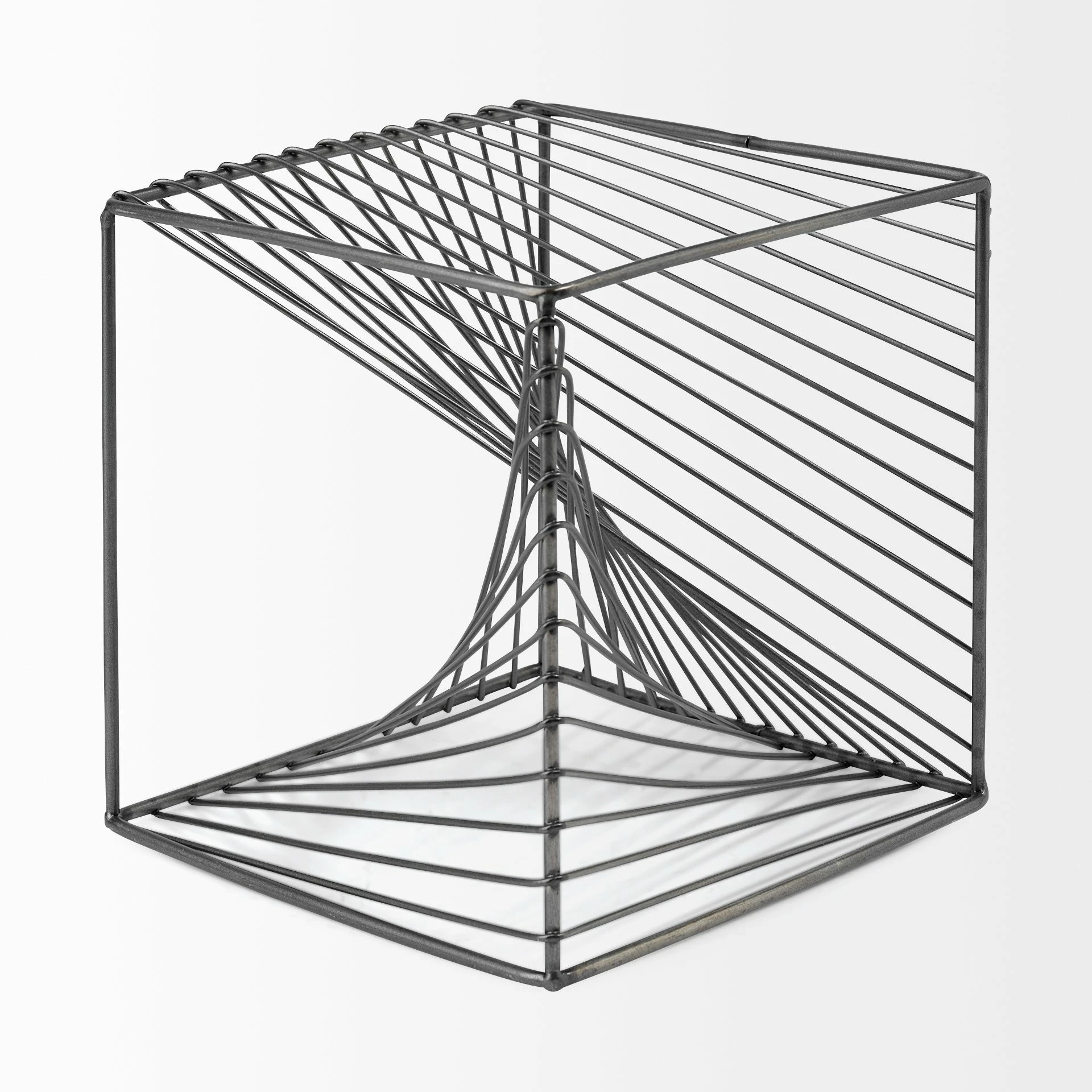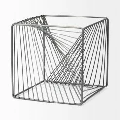 The Rochon is an industrial-inspired decorative object that can be described as a hollow metallic cube finished in a gunmetal grey tone with geometric, spiral details.