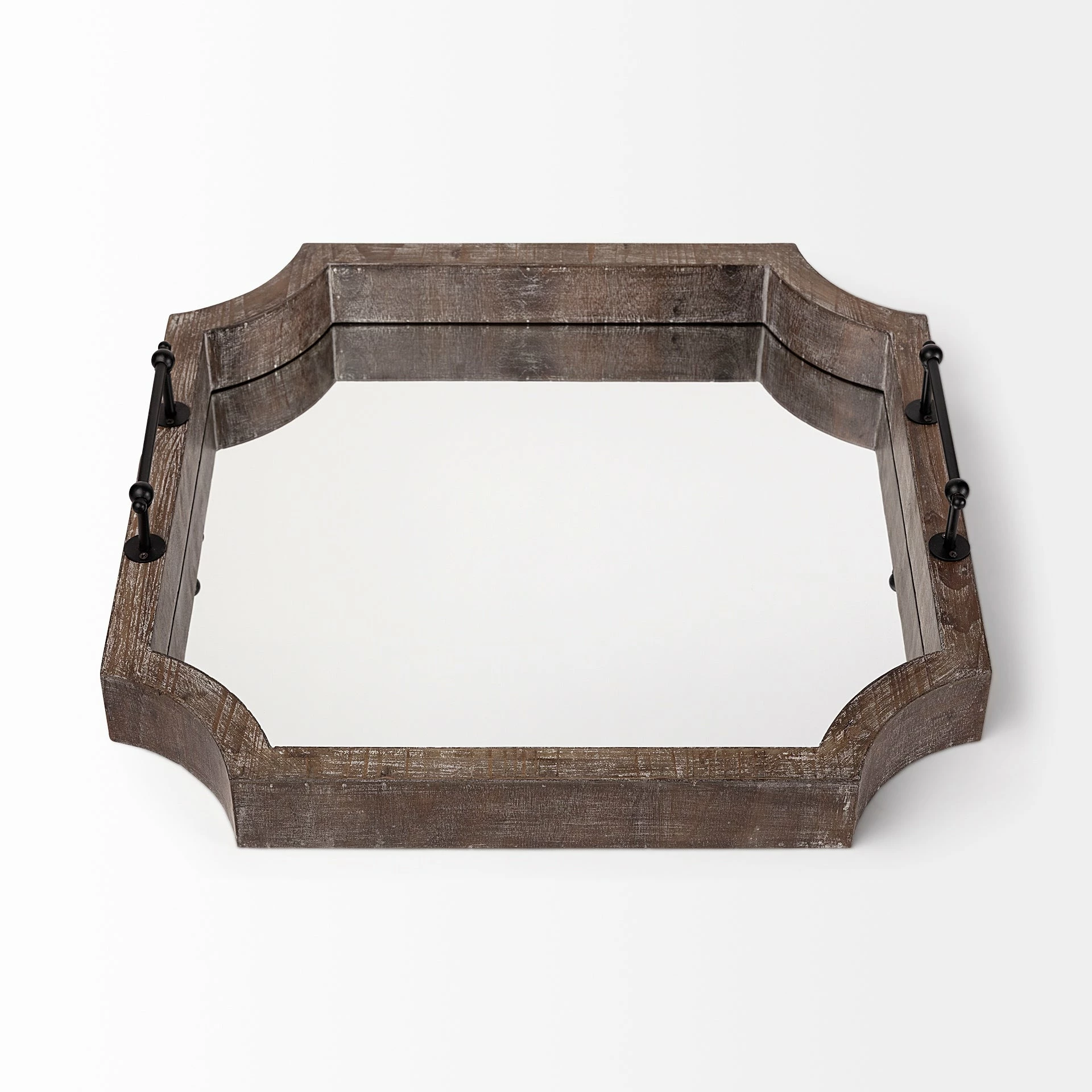 The Shrouda tray, measuring 24″W x 24″D x 6″H, is a stylish addition to any space. - Wood and Mirror Construction