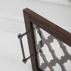 Showcase your traditional style with this brown wood tray on display in your home. This wood and glass tray with metal handles features a quatrefoil pattern to capture attention.