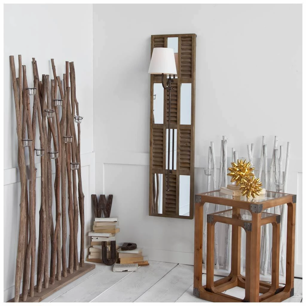 The Stoyo is an exceptionally crafted, shutter inspired wall sconce. It features a slated wooden body that flaunts a mirror-inlay pattern on it which hosts the chassis – a sleek, copper-toned metal beam. Mounted atop the beam is a sophisticated, white colored fabric shade that produces the perfect ambient light that is just right for your space. The Stoyo, thanks to its amazing color combinations and meticulous design, fits perfectly in spaces based on the Farmhouse design style. It uses a standard, 60-Watt E26 bulb (Sold Separately) and is not hardwired so as to allow for easy set-up – simply turn the sconce on/off by plugging or unplugging the wire from the wall socket.