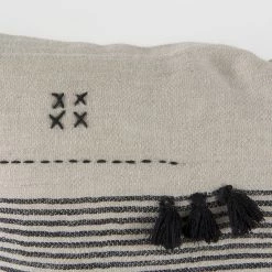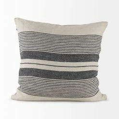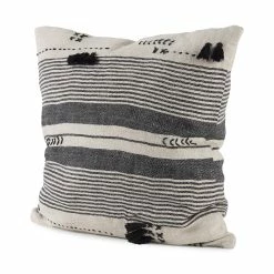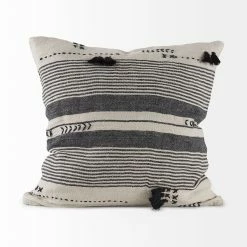 The Thalia is a 13L x 21W Black and Beige Fabric Striped and Fringed Decorative Pillow Cover with zipper closure. Also available in 18 x 18. Cover only. Insert not included (sold separately).