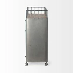 Featuring two meshed metal doors with a shelf behind them and two drawers, the Udo is a metallic rolling cart finished in a gunmetal grey tone. The Udo also flaunts a fir wood top with an extended metal railing to keep items in place when moving around. Equipped with locking caster wheels, the Udo looks gorgeous in spaces based on the Industrial and Mercana Modern design styles.ย