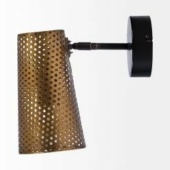 Featuring a juxtaposition of colors, the Wesley I is a spectacular wall sconce that boasts of a black-toned, circular wallย base that complements theย stunning antiqued-gold toned, perforated metal lampshade. - Single, Adjustable Light